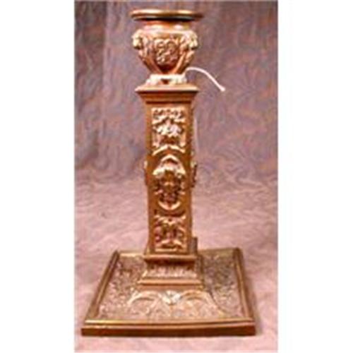Attractive single (1) bronze candlestick. Square base and stem decorated with roman/renaissance motifs. Nice individual accent piece for adding texture to a grouping of accessories.