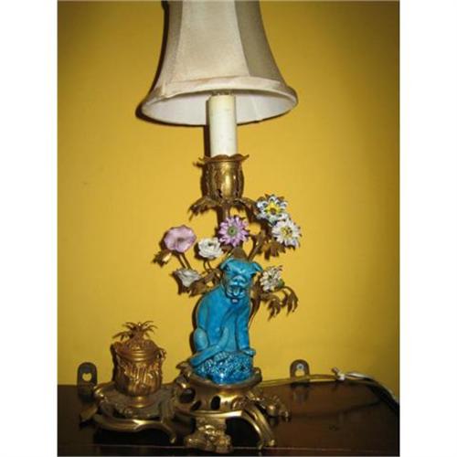 FABULOUS SMALL LAMP WITH PORCELAIN TURQUOISE FOO DOG, ON BRONZE MOUNTS WITH A SMALL BRONZE INKWELL AT THE SIDE OF THE DOG. THE INKWELL HAS THE ORIGINAL CLEAR GLASS LINER. THIS LAMP WAS ORIGINALLY FOR A CANDLE AND WAS CONVERTED AT A LATER STAGE. IT IS VERY UNUSUAL AND THE BRONZE IS OF THE HIGEST QUALITY. A GREAT PIECE TO ADD TO YOUR COLLECTION. THE LAMP HAS NEW WIRING AND A NEW SMALL SHADE.