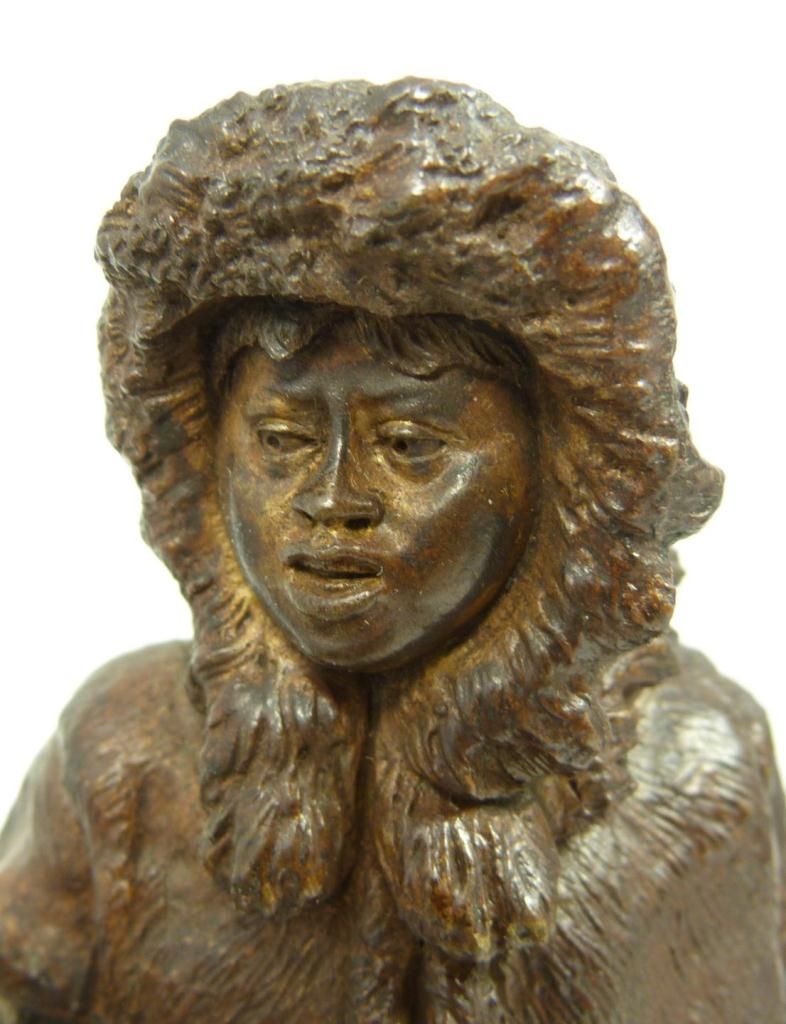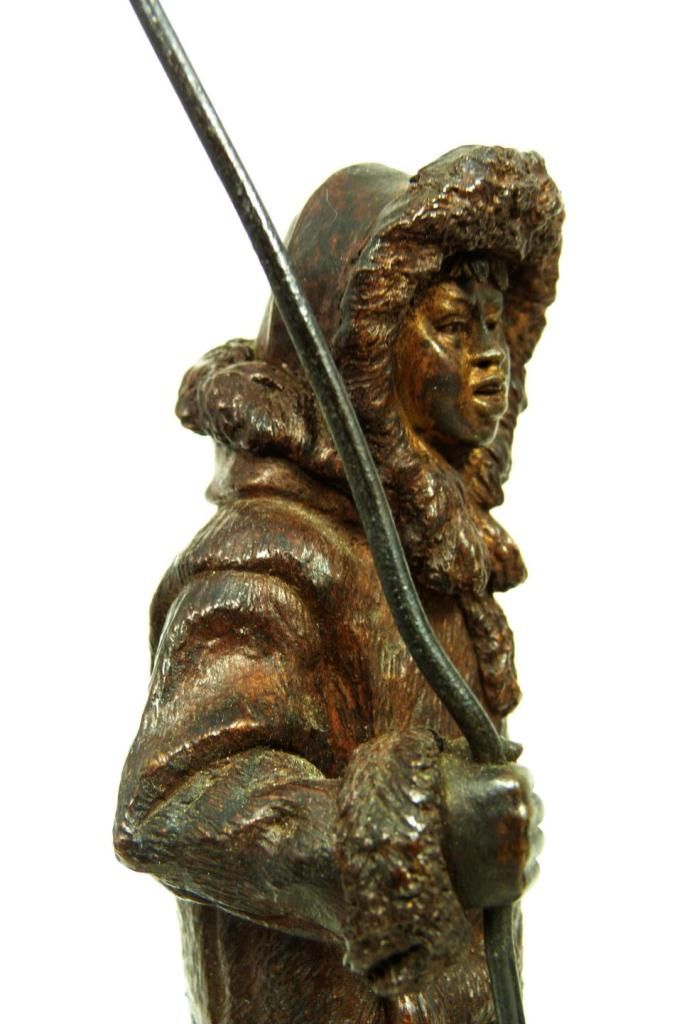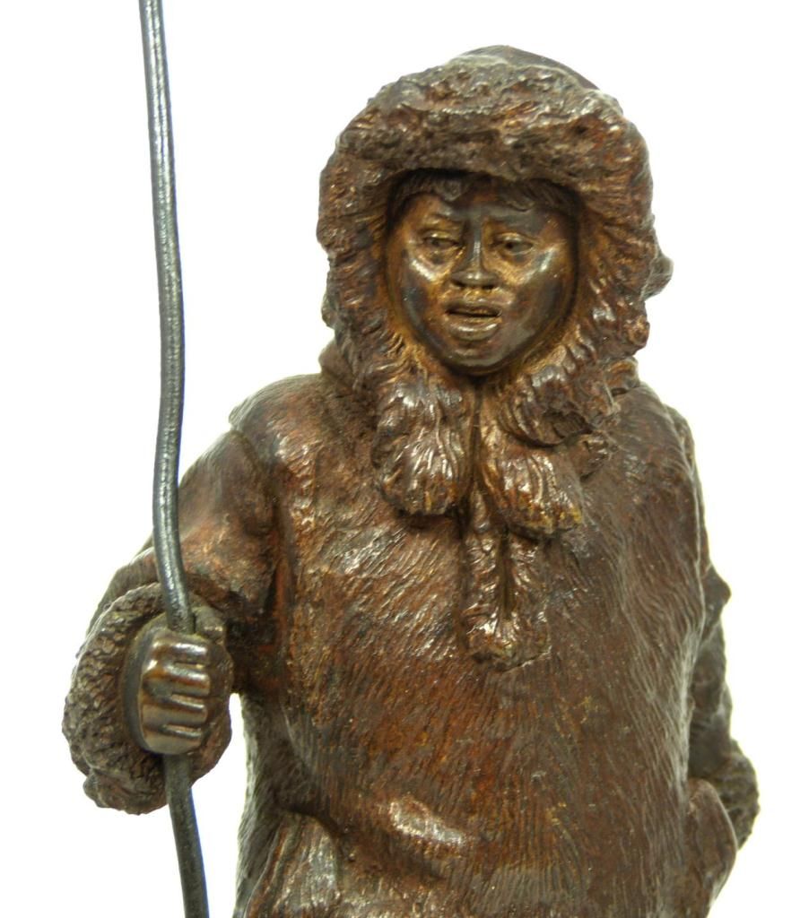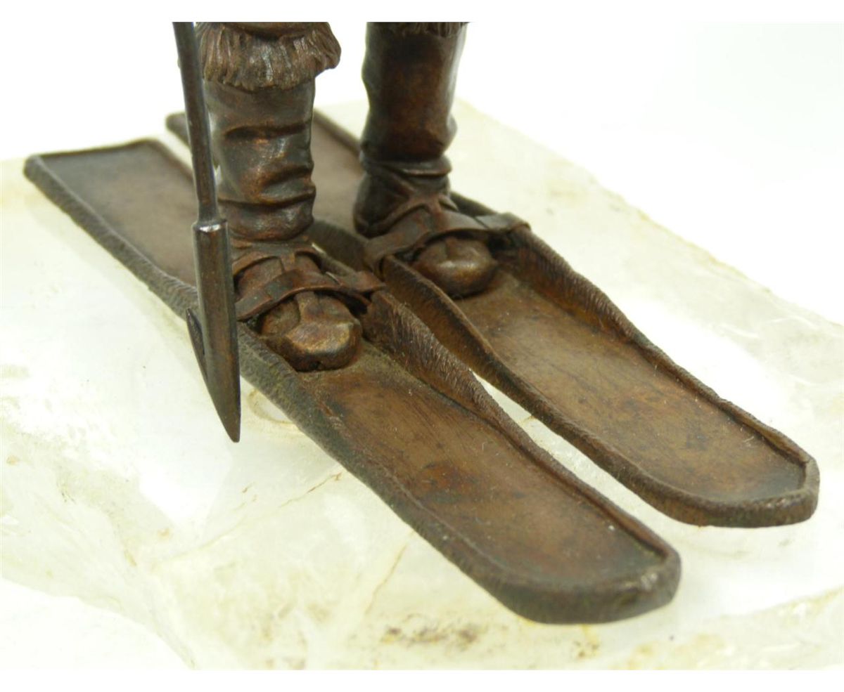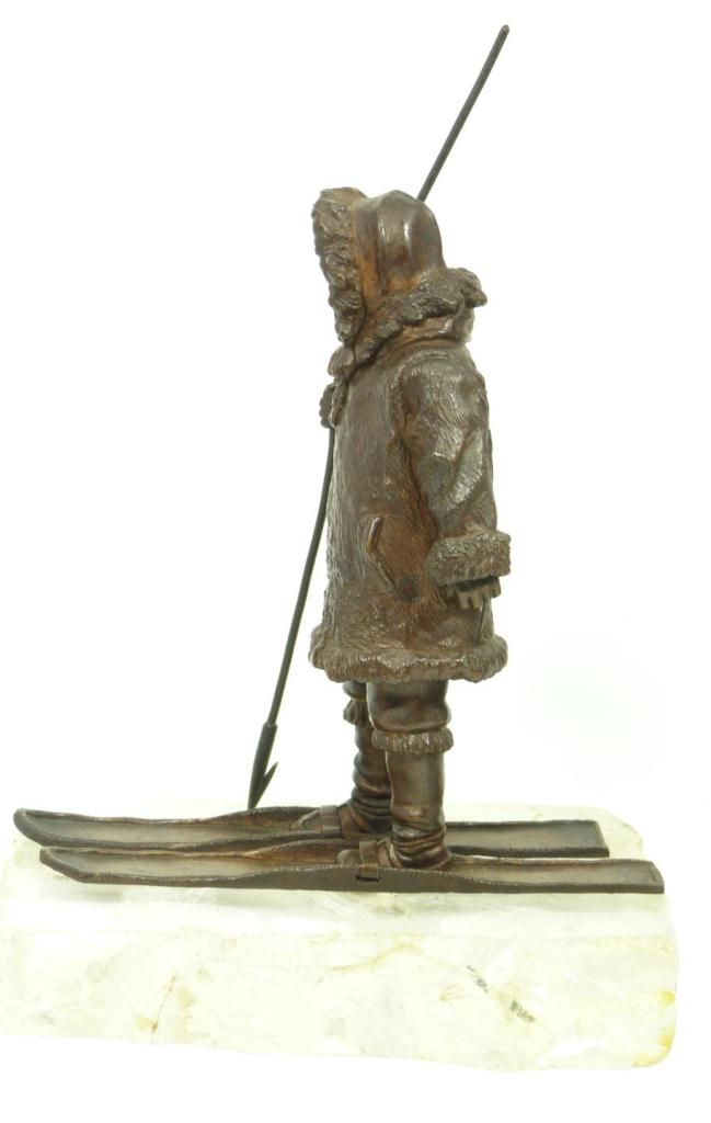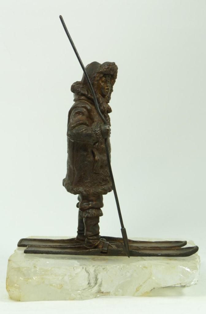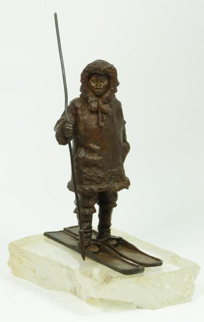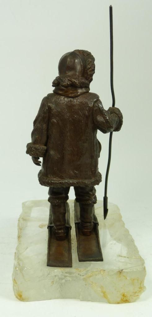 Bronze Inuit Eskimo figure depicted standing on skis and holding a spear to right hand. The figure is mounted on a rock crystal base. Measures 8 1/2" height + 1 1/4" base height x 6 1/2" length x 4 5/8" width (21.5cm + 3.1cm x 16.5cm x 11.7cm). Total weight of 1355 grams.
