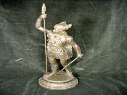 BRONZE-LIKE SCULPTURE OF WARRIOR 18" WITH SWORD AND SPEAR.