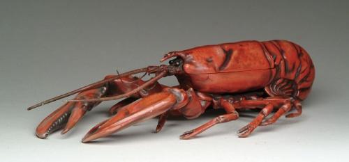 BRONZE LOBSTER INKWELL. Truly outstanding figural inkwell depicts Maine lobster. Top of head is hinged and opens to reveal a double inkwell. The bronze lobster is finished in a beautiful realistic polychrome red. SIZE: 12-1/2 in. l x 7 in. w. CONDITION: Very good to excellent. 5-61585