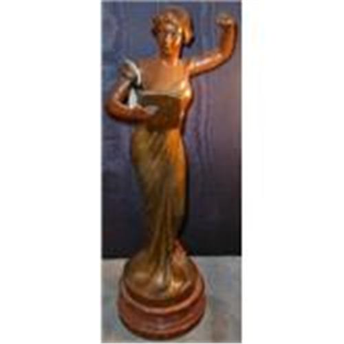 Signed Art Nouveau bronzed staute (spelter or white metal) of a charming young lady reading from a paper or book. Maybe an actress, muse, orator or lyric poetess. Her pose and expression are more playful than