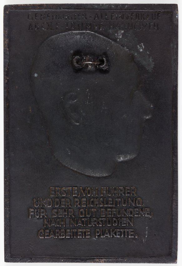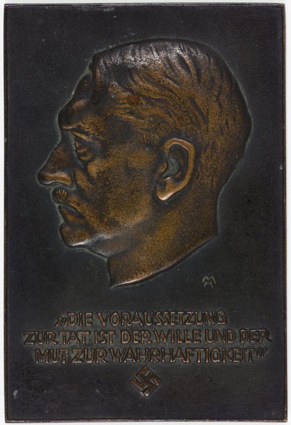 Bronze plaque showing Adolf Hitler in a left profile, 5 5/8a" x 3 3/4", a swastika at bottom just beneath Hitler's quote in German: "What is required is the will to act and the courage to be truthful." The plaque was commissioned and sold by Adolf Trumpf of Hannover, Germany, in honor of Hitler and the Nazi leadership.