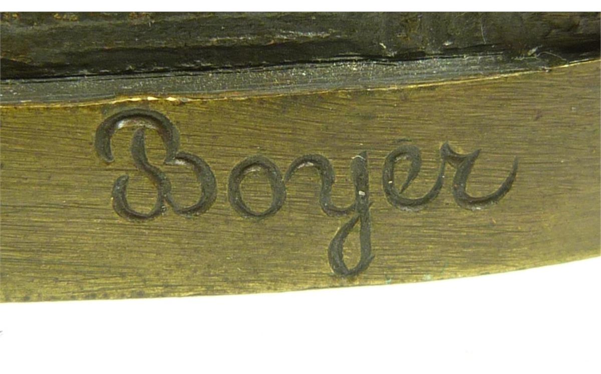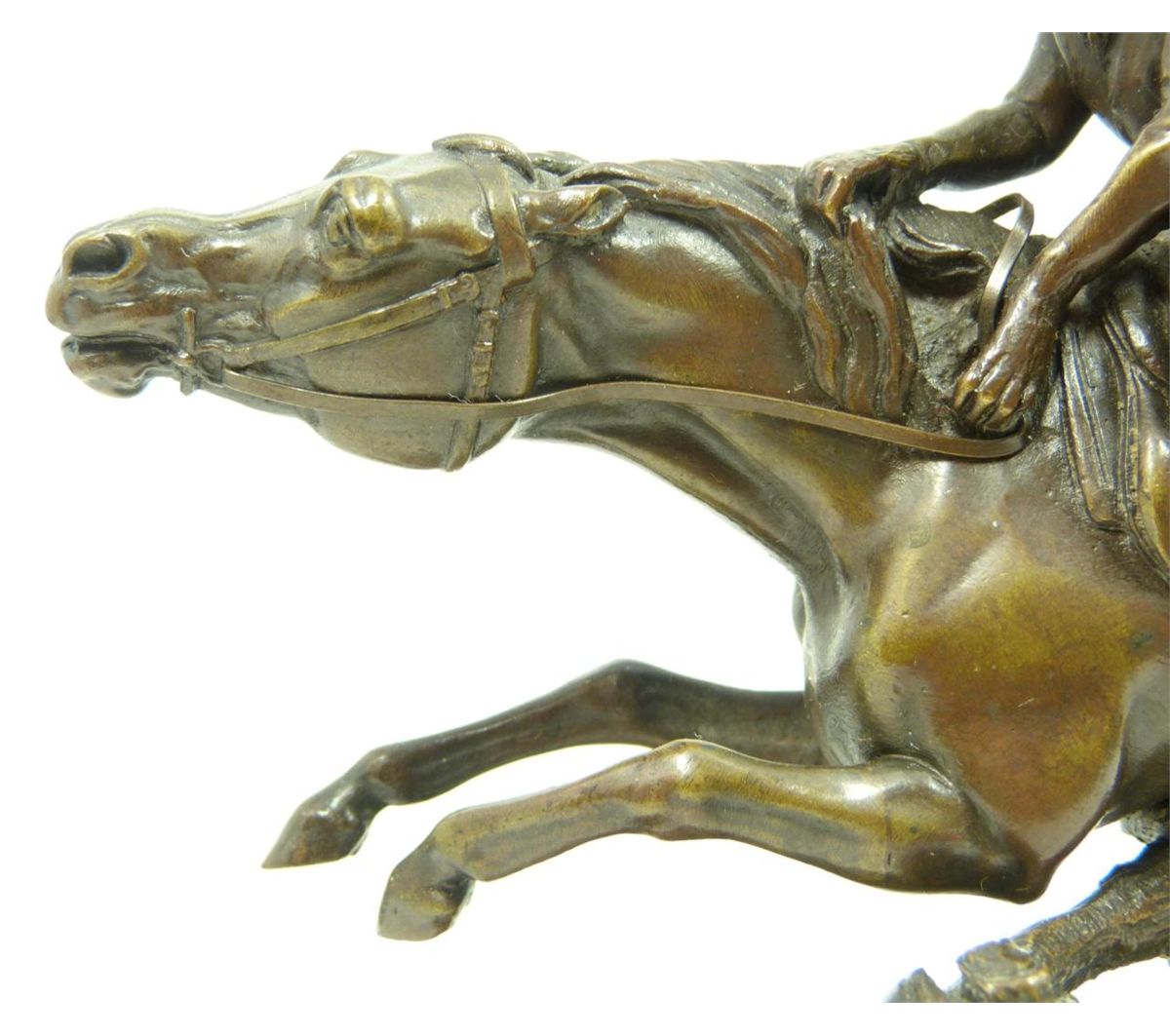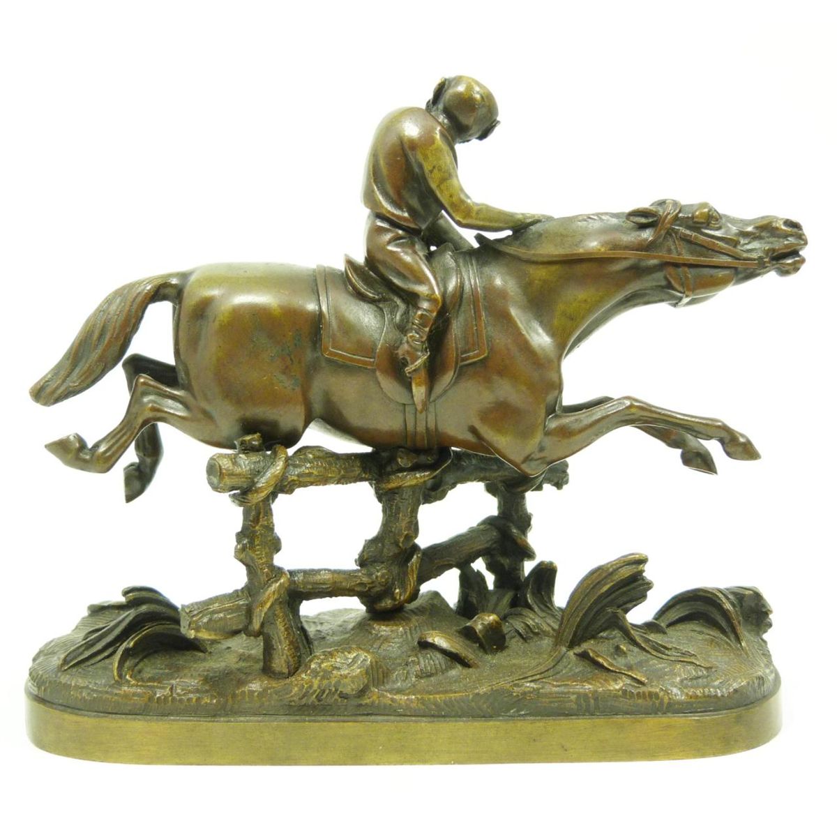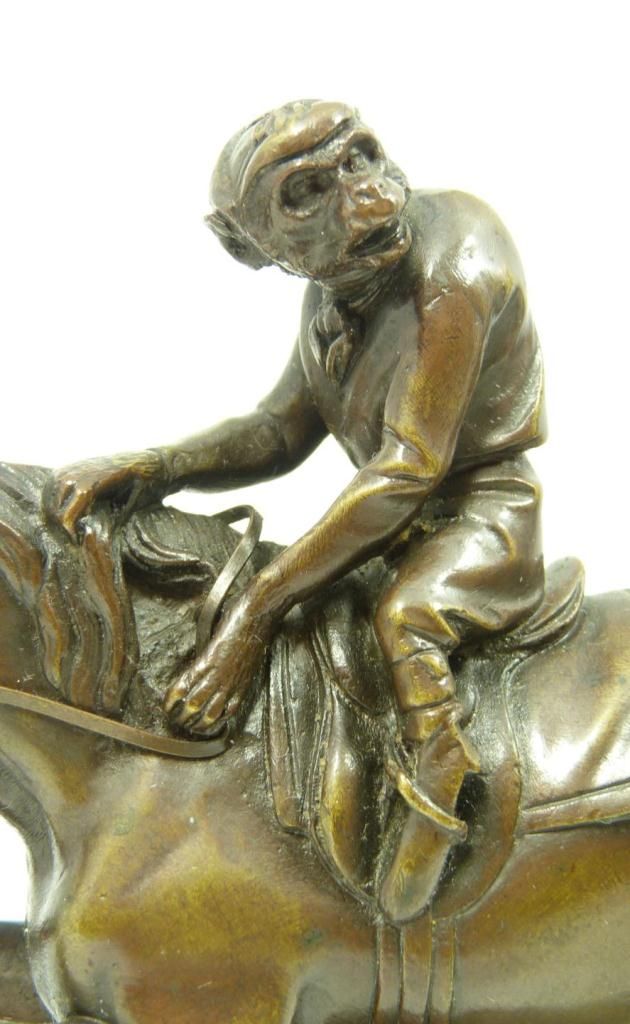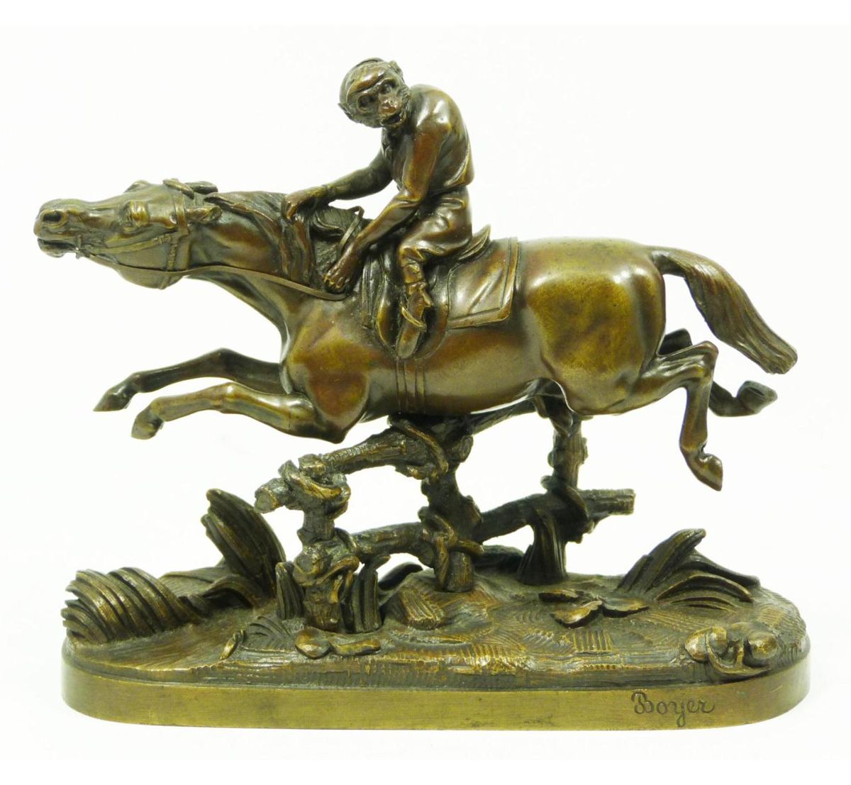 Emile Boyer (FRENCH, 1877-1948) bronze sculpture depicting a monkey riding on a horse as he is clearing a wooden fence. Signed Boyer to side of base. Measures 5 1/8" height x 6 1/2" length (13cm x 16.5cm). Total weight of 974 grams. Provenance: Sam Feldman Collection.