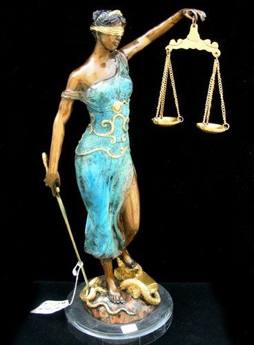Lady justice with scales in one hand and sword in her other. Four color patina. 18 1/2" high.