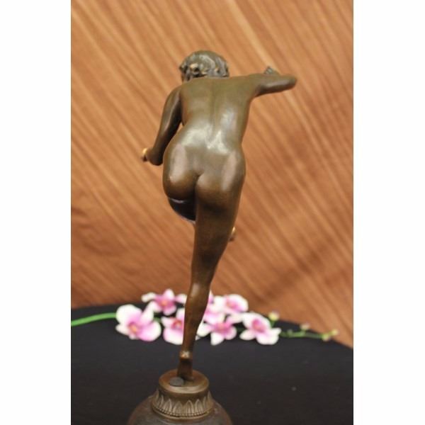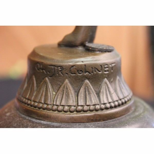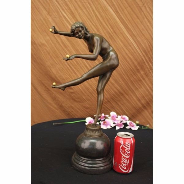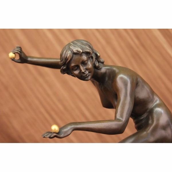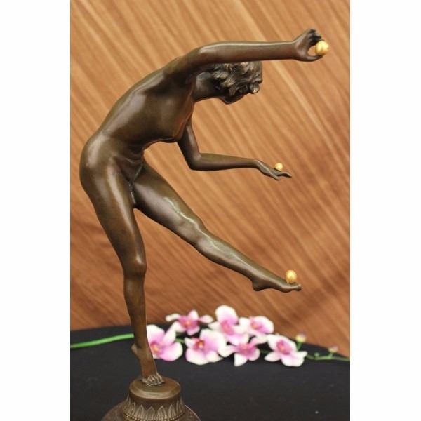 An Art deco gilded bronze figure of a girl juggling three balls while standing on tip toe on a black marble base with brown patina. Signed on base C J R Colinet for Claire Jeanne Roberte Colinet (1880 - 1950). Height including base 20 inches width 10 inch in diameter base is 6" . Condition: This sculpture is in a very good condition. Bronze Dimensions with Marble Base:Height 20" x Width 10" Marble Dimensions: diameter 6" " . Height without base: 16" Weight : 13 LBS Inventory : 3460B23743