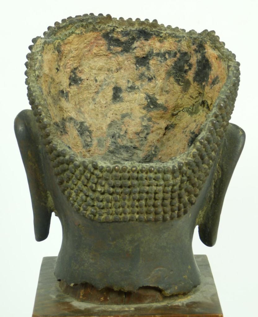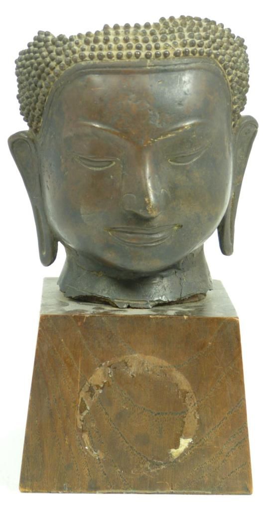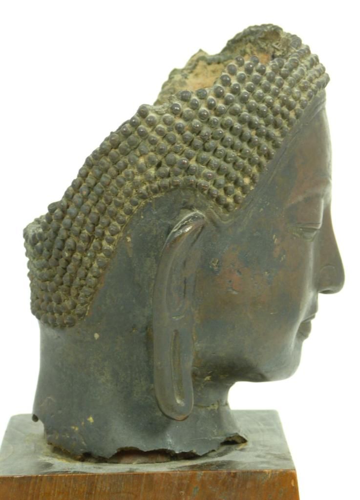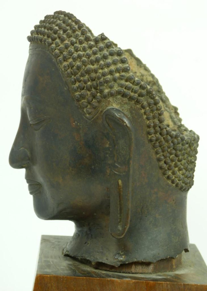 Thai bronze partial Buddha head on fitted wooden base. Measures 6 1/8" height + 3 3/4" base height (15.5cm + 9.5cm). Total weight of 2.5 kilograms.
