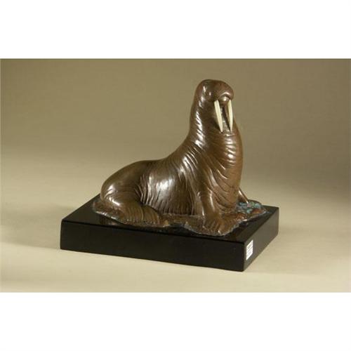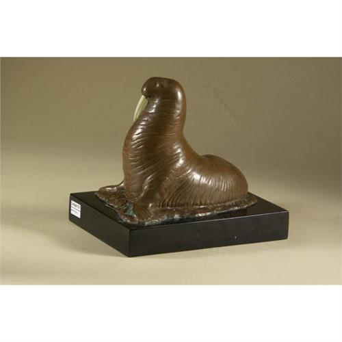 BRONZE: Lifelike bronze sculpture of a Walrus with faux ivory tusks mounted on a black marble plinth, unattributed, signed both on the body of the walrus and on the underside of the base (illegible), dated 1981 and numbered 34/500, 10'' x 7.75'' x 10'' with base.