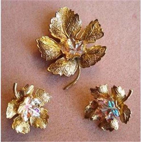 BEAUTIFUL 3 PIECE SET CONSISTING OF FIGURAL BROACH AND PAIR OF MATCHING EARRINGS, DEPICTING GOLD TONE LEAFS ACCENTED WITH SCALLOPED IRIDESCENT RHINESTONES, as per images, Excellent condition, never used, Brooch measures about 1 3/4" x 1 1/2" and each earring about 1" - US Buyer to pay 7.00 for shipping plus insurance.THANKS.