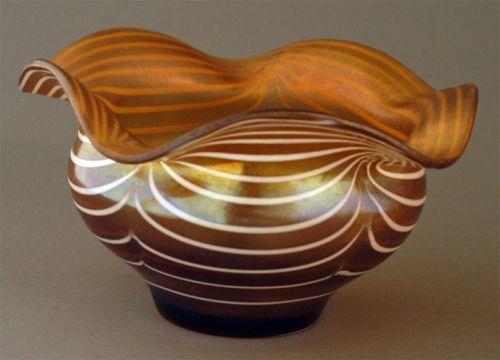 BROWN AND GOLD ART GLASS BOWL probably Imperial, with white wave decoration, shaped rim, unsigned, 8 3/8" diameter