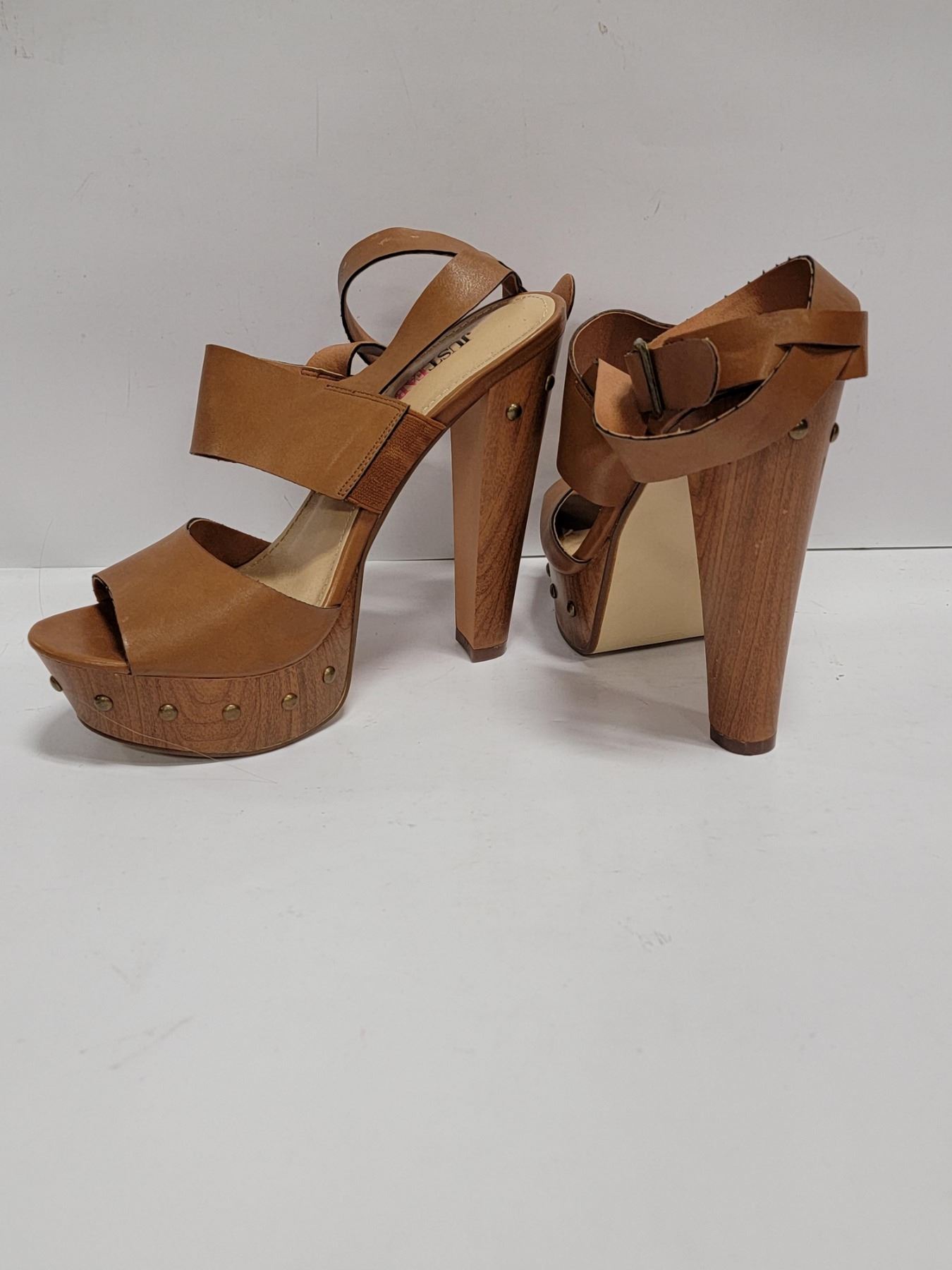 BROWN ANKLE WRAP CHUNKY HEEL SHOE - SIZE 9