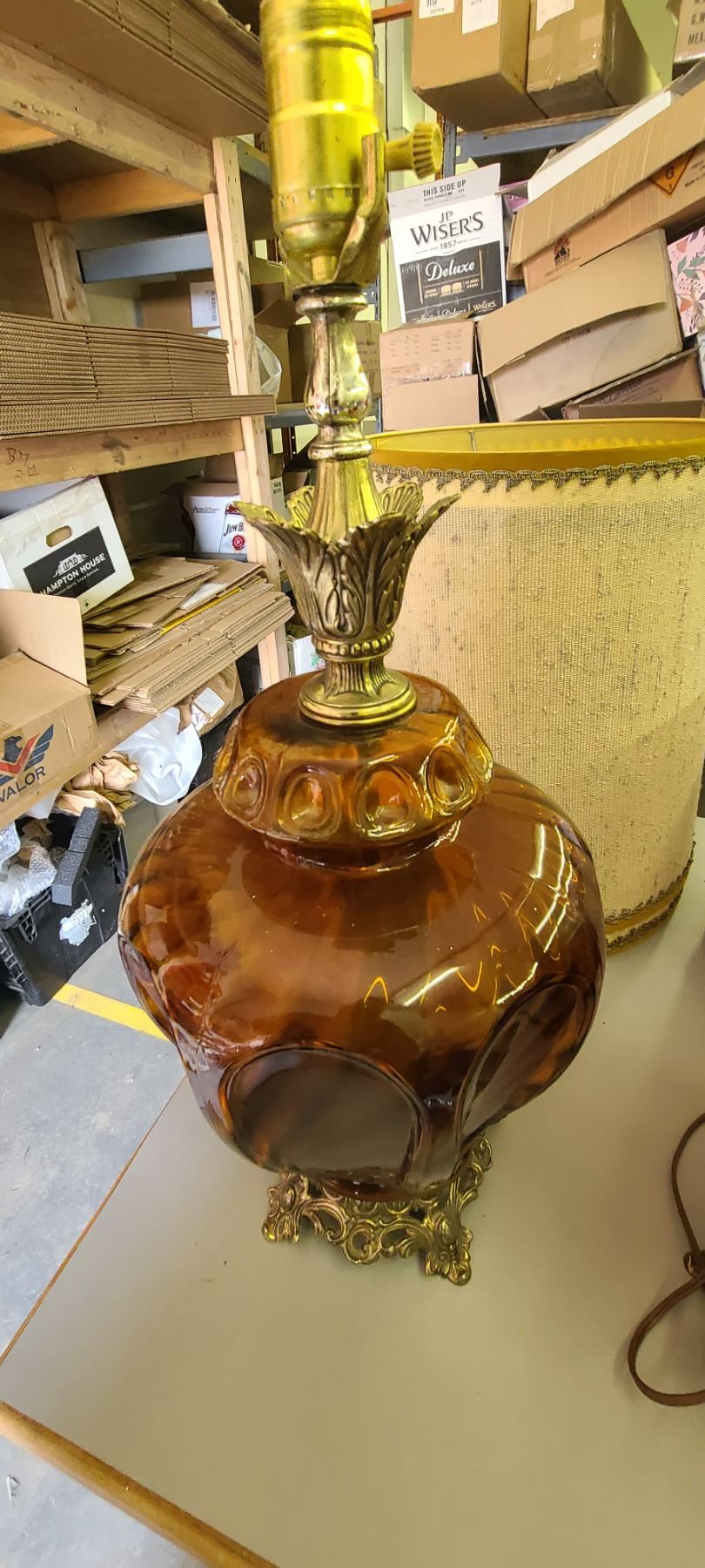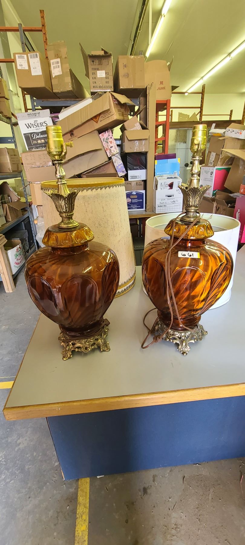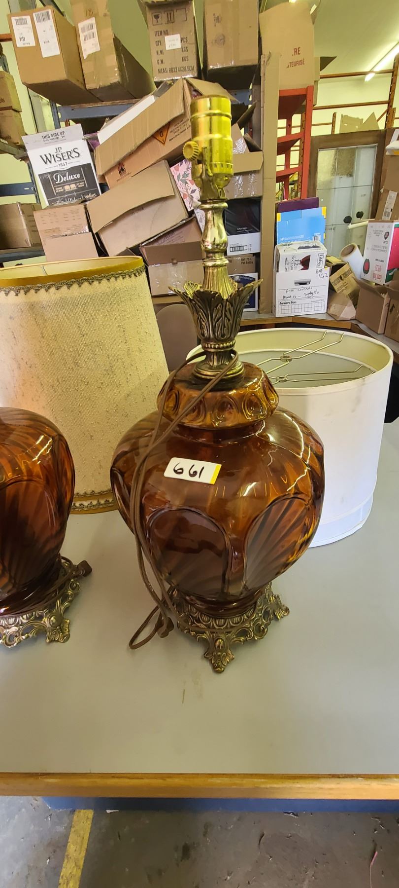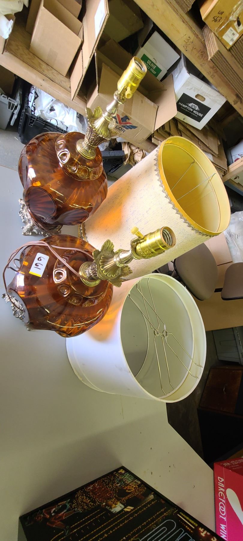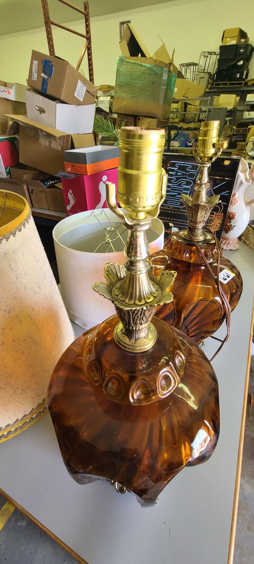 BROWN GLASS LAMPS QTY 2, COMES WITH 4 LAMP SHADES