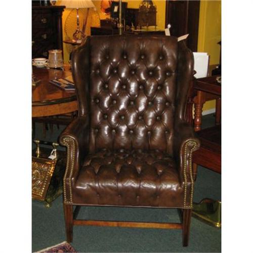 A VERY HANDSOME BROWN LEATHER TUFTED WING BACK ARMCHAIR WITH STRAIGHT REEDED FRONT LEGS. IT IS IN VERY GOOD CONDITION AND VERY COMFORTABLE. THE LEATHER IS SOFT AND SUPPLE AND HAS BRASS NAILHEAD TRIM. A GREAT CHAIR FOR A LIBRARY OR OFFICE. THIS IS NOT ANTIQUE BUT WELL MADE CA 1970.