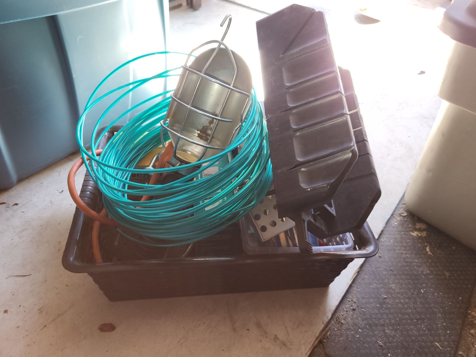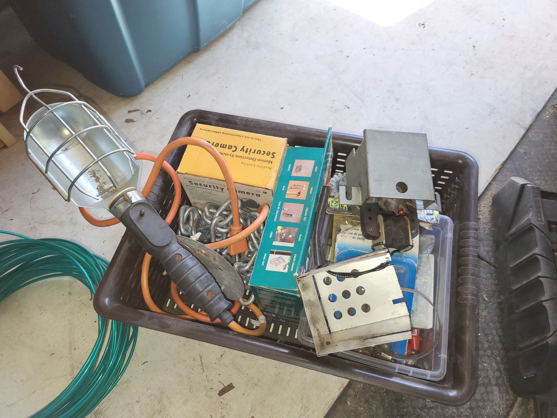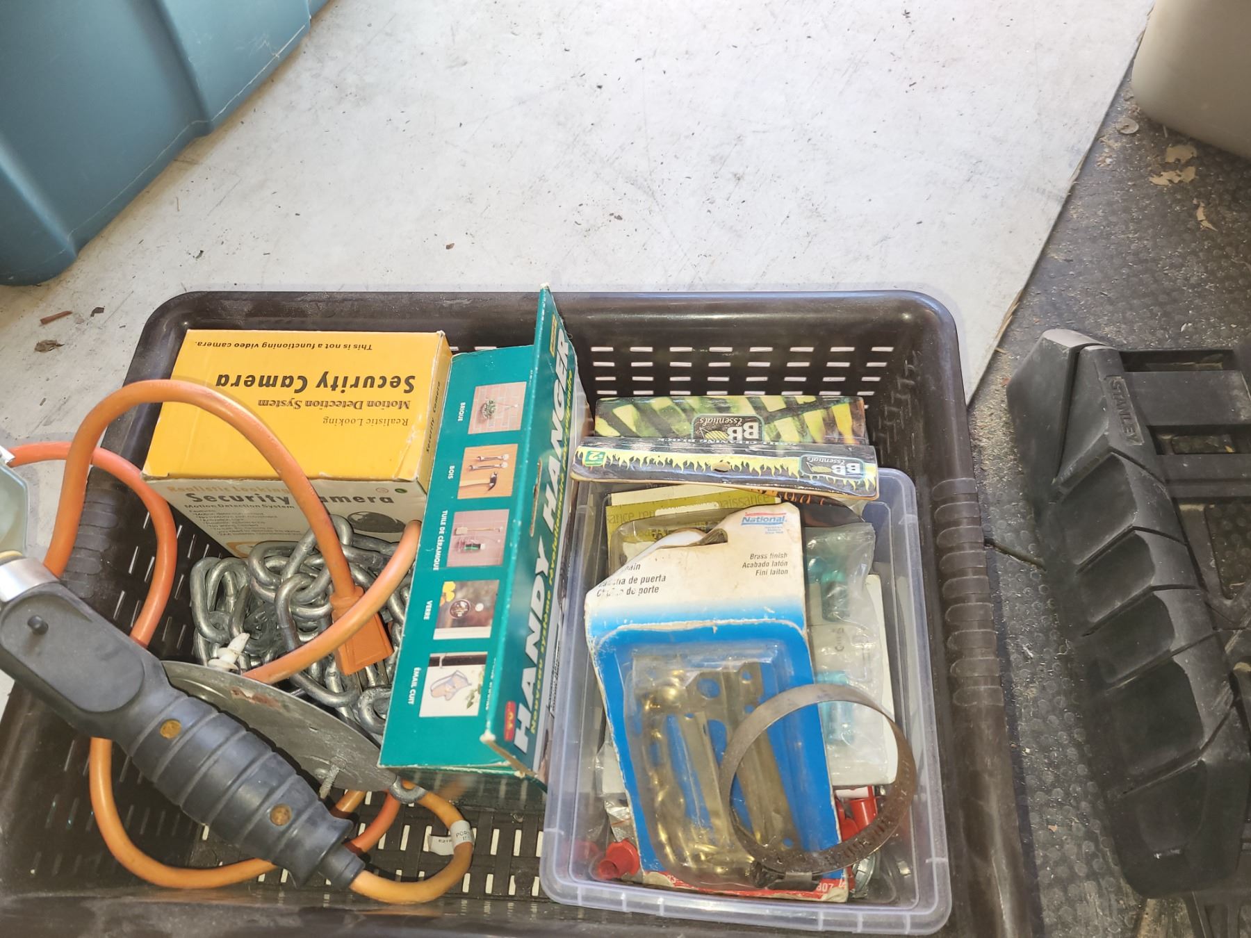 BROWN PLASTIC TOTE OF RANDOM HARDWARE AND SUCH