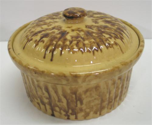 BROWN SPONGEWARE COVERED BOWL. Shows signs of crazing. 3.25” H, 7” Dia.