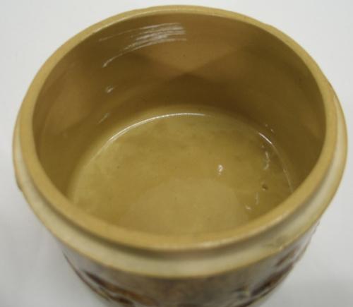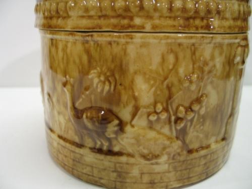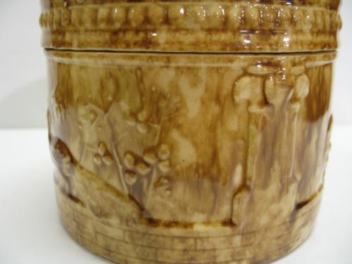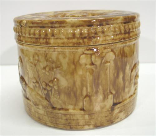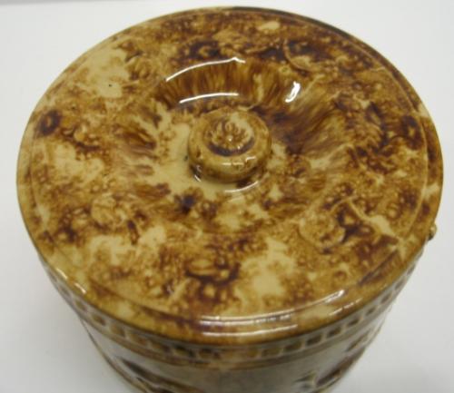BROWN SPONGEWARE BUTTER CROCK WITH LID. Crazing to interior portion of lid. Embossed peacock and urn decoration around body. 5” H, 6” Dia.