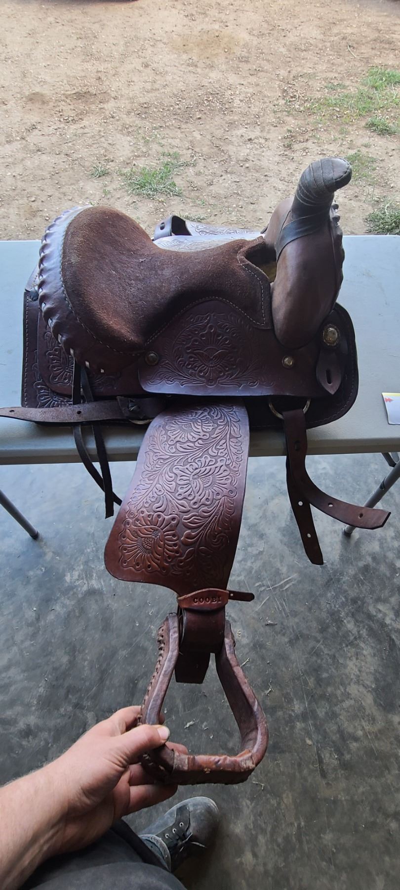 BROWN TOOLED LEATHER SADDLE & STAND