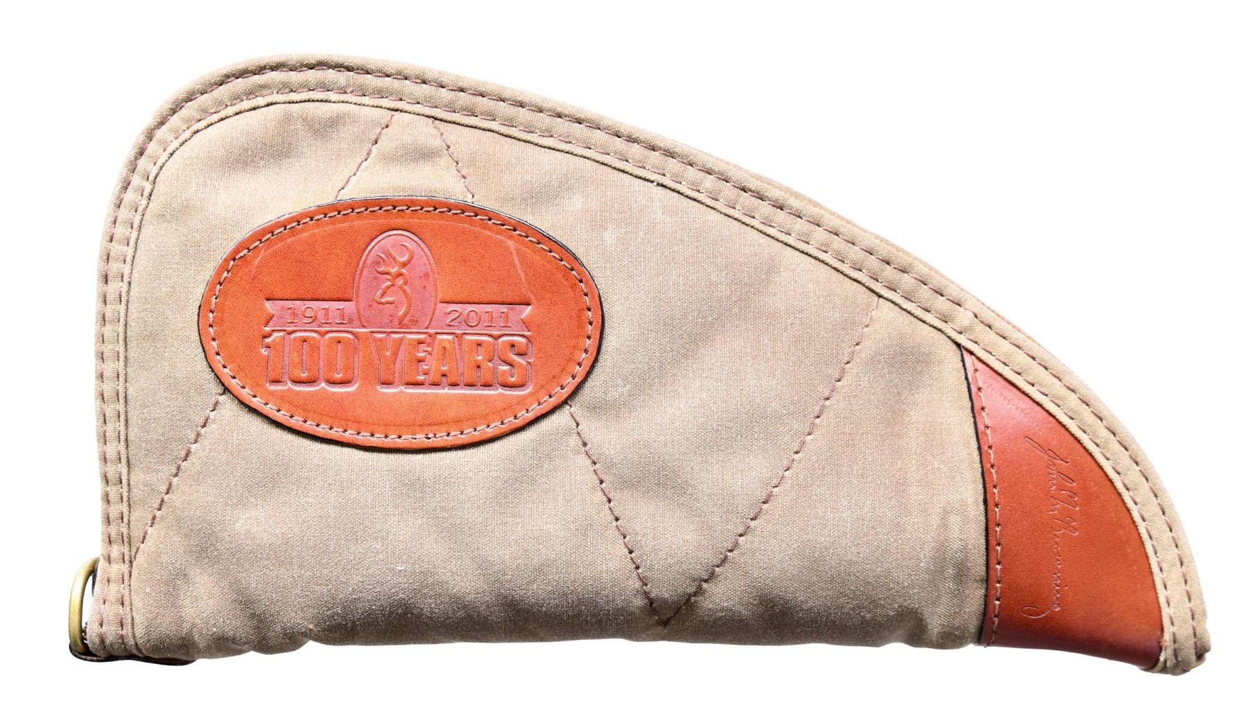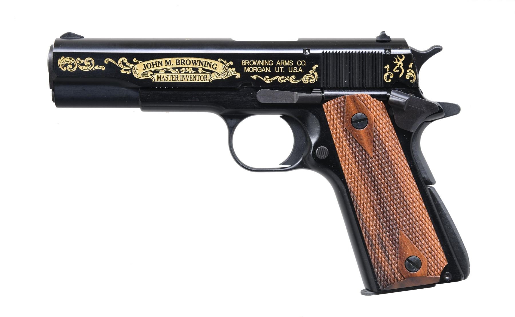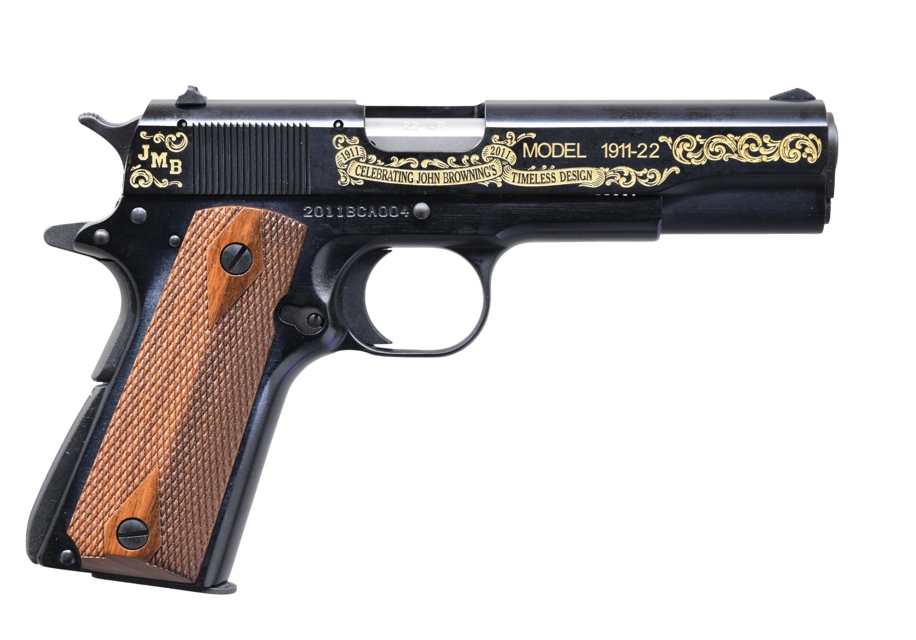 PISTOL. Cal. 22 LR. S# 2011BCA004.Bbl. 4 1/4". GI style sights. 2011 made Browning Collector's Association Commemorative rimfire 1911 pistol. Slide has various gold etchings & scroll engraving celebrating the life of John Moses Browning. Matte black finish. Checkered hardwood grips. MAGS: 1-10 rd. UNATTACHED ACCESSORIES: matching numbered factory box with softcase, trigger lock, manual & paperwork.. CONDITION: all aspects near excellent including bore. PROVENANCE: The Estate Collection of Charles Wagner. (25-301/MJC). MODERN. $400-600.