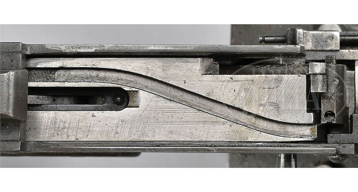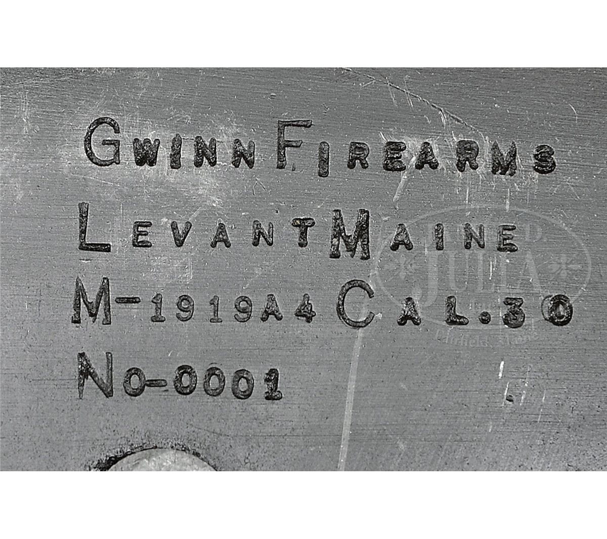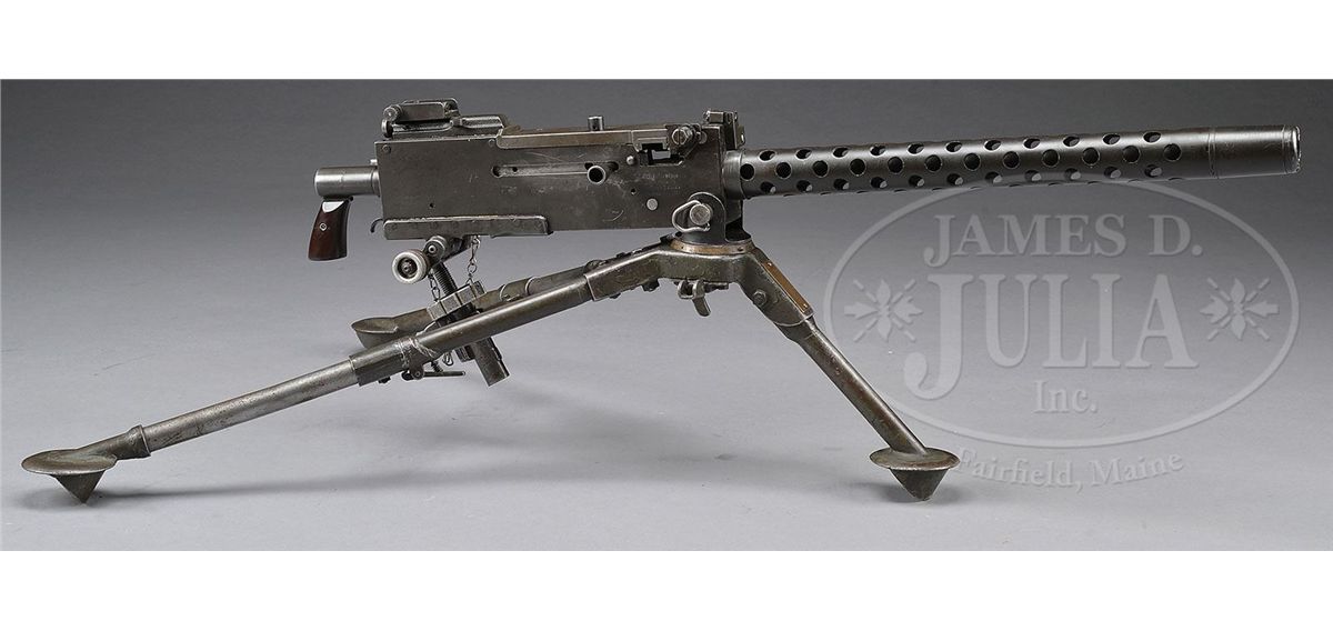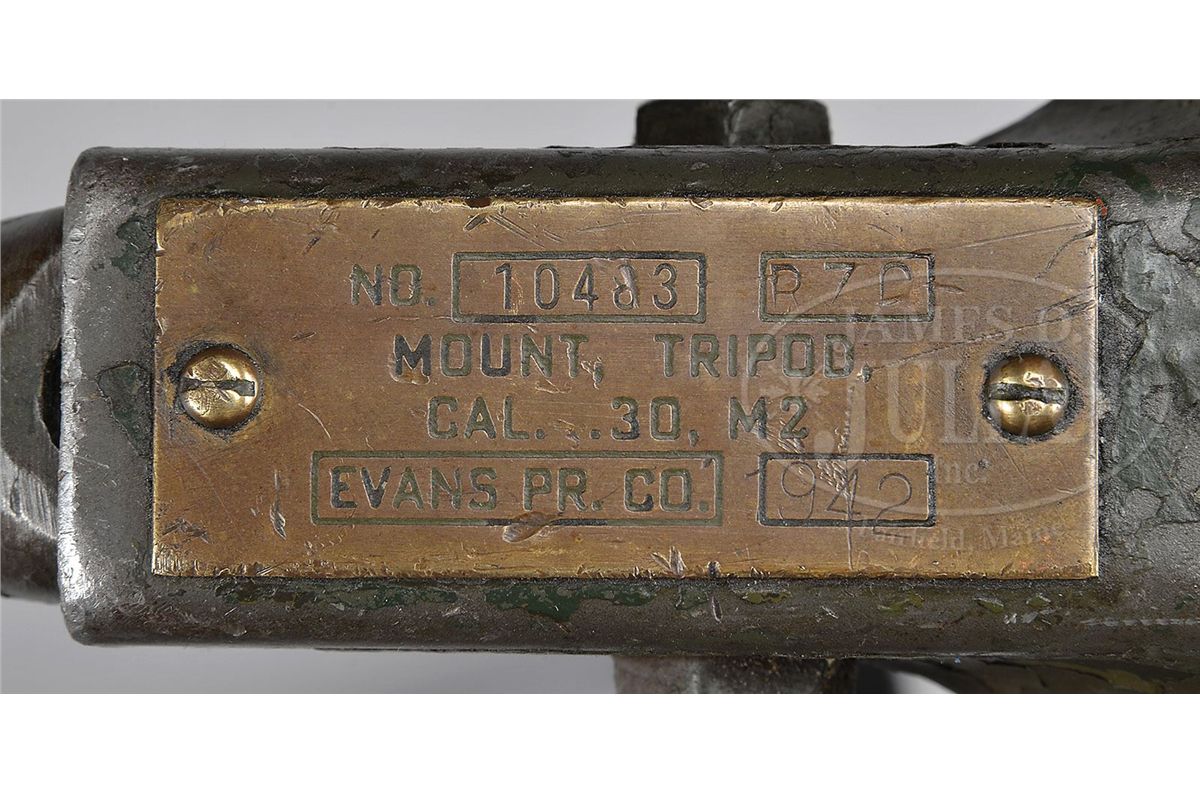 SN 0001. Cal. 308. 24" bbl. This appears to be an "all original" WWII vintage Browning 1919 A-4 gun kit on a Gwinn Firearms registered sideplate, SN 1. Although registered as 30-06 it is currently in 308 caliber. This example has the bullet guide at the front of the trunnion and cartridge stop modification riveted to the right sideplate. Rear spacer for .308 is not present. Bolt is unmarked on top, indication it is not a later 7.62 x 51 bolt. Action functions smoothly when operated by hand. It is mounted on a WWII M-2 tripod marked with a brass plate "Evans Pr. Co. 1942". Muzzle is marked "7/8 DIA". This weapon appears fully functional. Gun and sideplate was registered by consignor's long time friend and associate Mac Gwinn of Levant, Maine, making this a piece of local history. PROVENANCE: Collection of Carl "Bill" Morrison. Acquired from long time friend Mac Gwinn. CONDITION: Overall appearance and condition is fine with a nice gray smooth patina to over 80% finish, most of the loss being on the top cover assembly. Trunnion is extremely clean and polished. Internals are fairly fine, as is bolt face. Although there is grime and dust along the recesses combined with oil, this gun action is in a very smooth and functional condition. Bore is excellent, shiny and bright. Right hand Bakelite panel is cracked horizontally completely through across escutcheon and has 1" chip out of base where it meets pistol grip. This cataloger does not doubt that this would be a fine shooting machine gun. 4-48657 JWK15