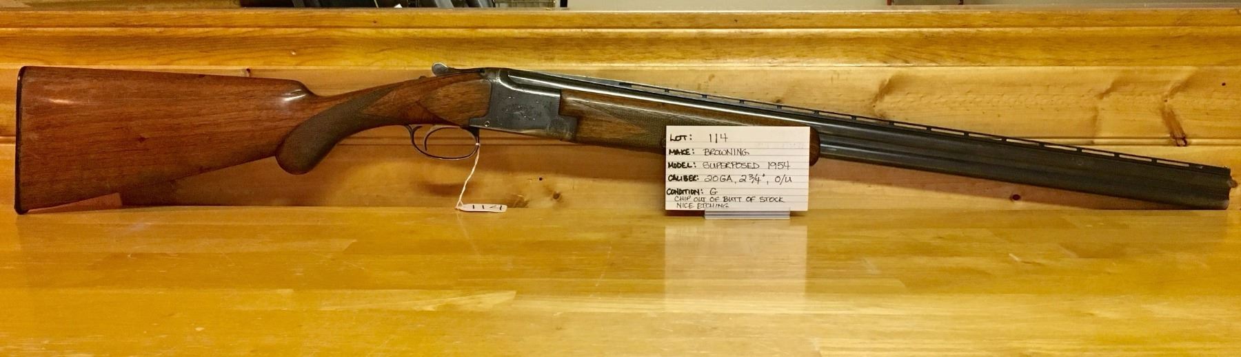 LOT: 114 MAKE: BROWNING MODEL: SUPERPOSED 1954 CALIBER: 20 GA, 2 3/4", O/U CONDITION: G, CHIP OUT OF BUTT OF STOCK, NICE ETCHING SERIAL NUMBER: 6961 EXTRAS: VENTED RIB