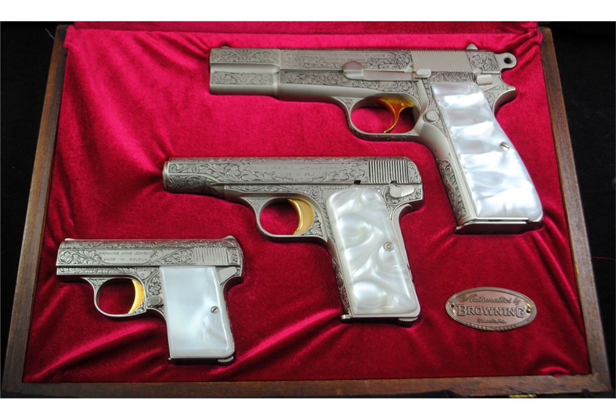 RARE BROWNING 3-PIECE RENAISSANCE SET - .25 ACP, .380 ACP (RAREST CAL. OF THE THREE) AN 9MM PARA . CAL. HI-POWER RENAISSANCE MODELS IN EARLY WALNUT CASE. ALL ORIGINAL RENAISSANCE CASED SETS HAD 9MM PARA.