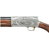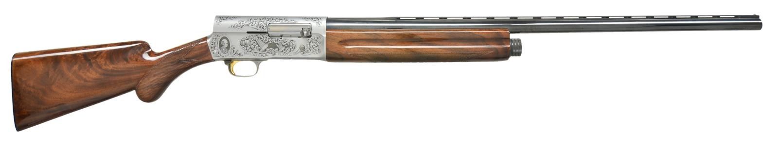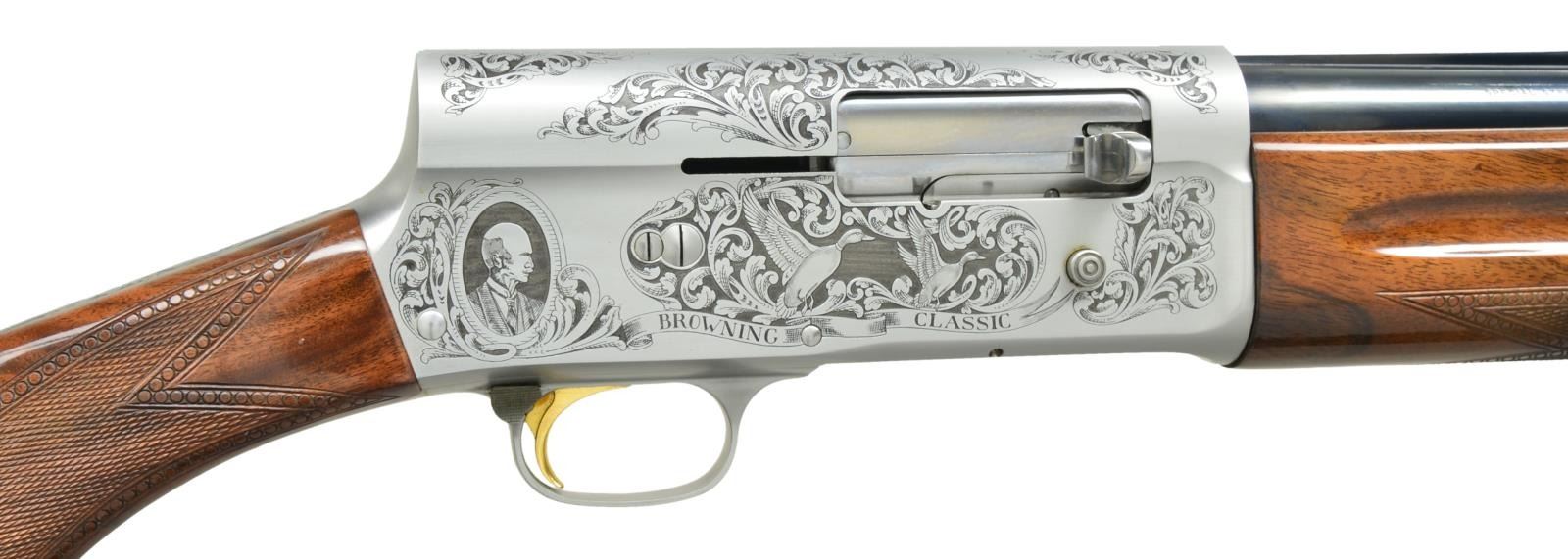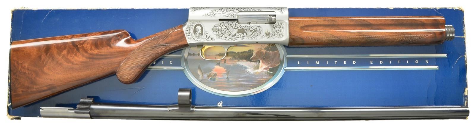 Cal. 12 Ga., 2 3/4". S# 211BC2795. Bbl. 28" VR with fixed mod. choke. Satin silver finished action. Right side has portrait of John Browning with flying mallards & banner marked "BROWNING CLASSIC". Left side has flying mallard over running retriever & banner marked "1 of 5,000". Figures are surrounded by foliate scroll with dark shaded backgrounds that extend to upper surface of action and tangs. Gold finished trigger. Forend and round knob stock of gloss finished fancy walnut have cut checkering with beaded borders. LOP: 14 3/8" over original buttplate. Limited edition of 5,000 introduced in 1984. Japanese mfg. UNATTACHED ACCESSORIES: original foam lined black box with decorative sleeve. Sleeve has tattered edges. CONDITION: near new, retaining over 99% wood & metal finish. Bright, near excellent bore. (22-2126/DS). MODERN. $2,000-2,750.