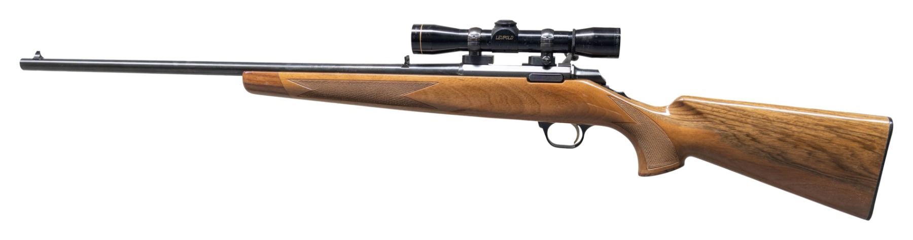 Cal. 22 LR. S# 06251PP136. Mfg. 1988 by Miroku. Bbl. 22". Open sporting sights. Leupold 4x Special duplex scope on Browning rings & bases. Checkered walnut stock w/ contrasting wood forearm tip & grip cap along with Browning buttplate. MAGS: 1 - 5 rd. CONDITION: all aspects near excellent including bore. Scope has near excellent finish with serviceable optics. (25-3697/MD). MODERN. $350-500.