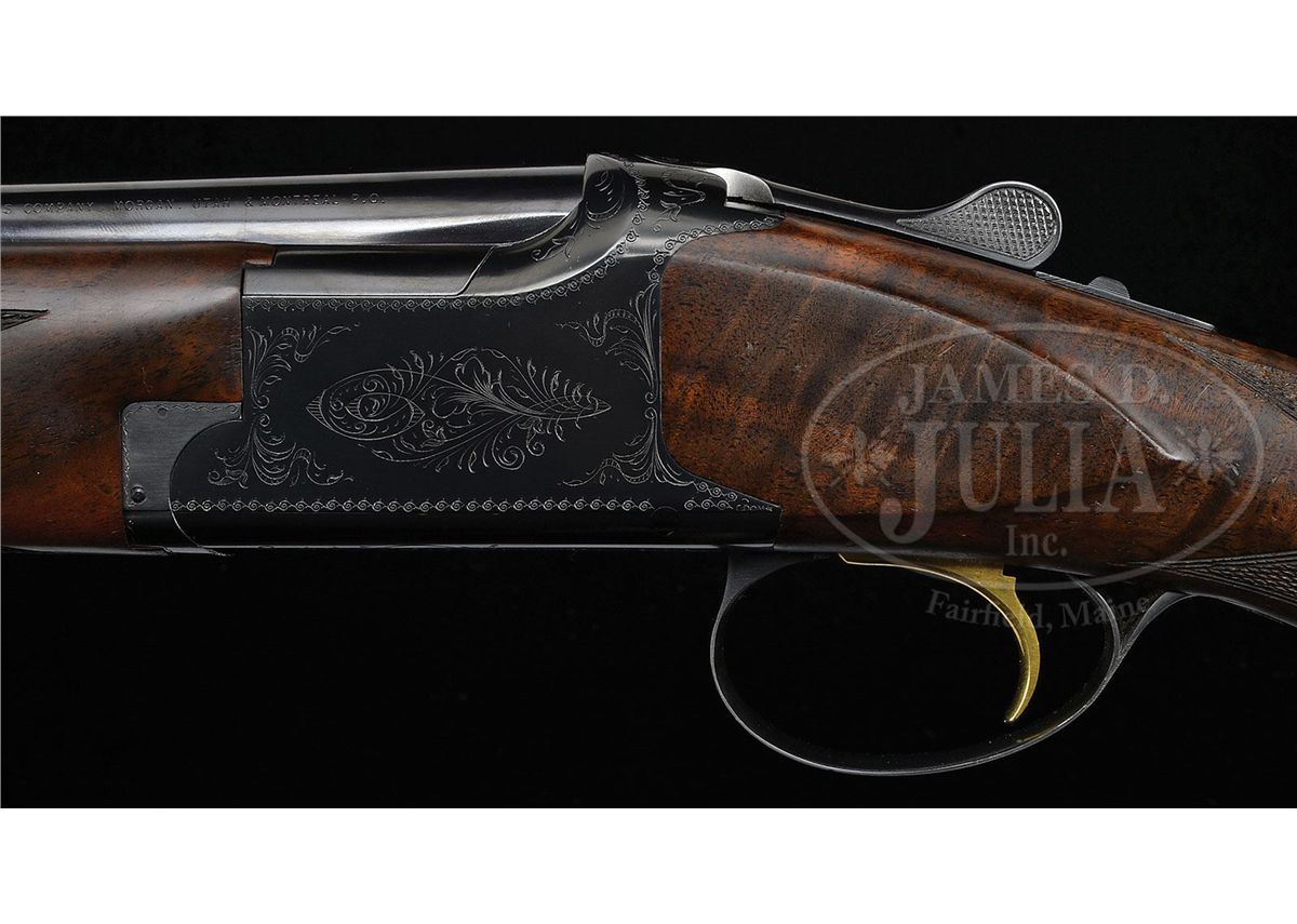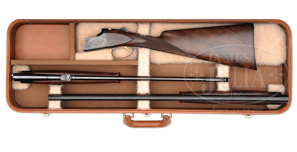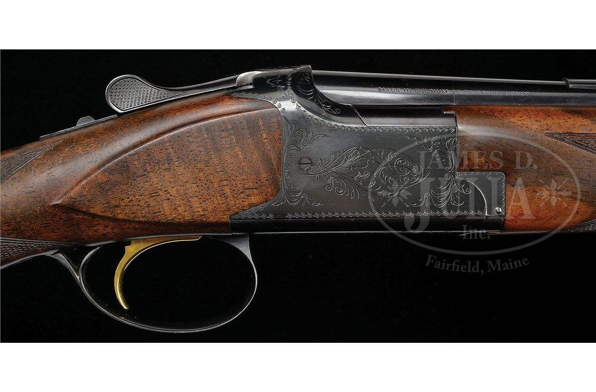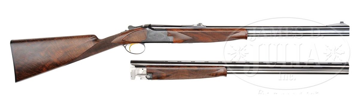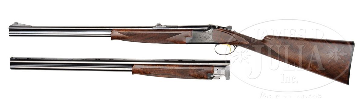 SN 177PM01223. Cal. 30-06 and 20 ga. 3" Chambers. 24" Rifle bbls and 26-1/2" shotgun bbls. Standard configuration and markings. Rifle bbls have folding U-notch rear sight in island base, and gold bead front in ramp base. Shotgun bbls have ventilated rib, choked modified and full. Nicely fiddle figured straight grip buttstock measures 14-1/2" over composition Browning buttplate. There are matching schnabeled one piece forends for each bbl set. Rifle bbls: Drop at heel: approx 2-3/8", drop at comb: approx 1-1/2". Weight: 7 lbs. 1 oz. LOP: 14-1/2". Shotgun bbls: Drop at heel: 2", drop at comb: 1-5/16". Weight: 5 lbs. 13 oz. LOP: 14-1/2". Typical Browning tan vinyl case accommodates both sets of bbls, and is lined in faux fur. Case contains instruction book and the key. CONDITION: Excellent, retaining nearly all of its metal finish with slight marks on bbls from sliding of forends, silvered on sharp edges of rifle forend, and with some minor marks. Stocks retain nearly all of their orig oil finish with some light marks, especially around left rear of side panel. Bores are excellent. Action is tight. Mechanically excellent. Case is excellent. 4-49034 MGM201