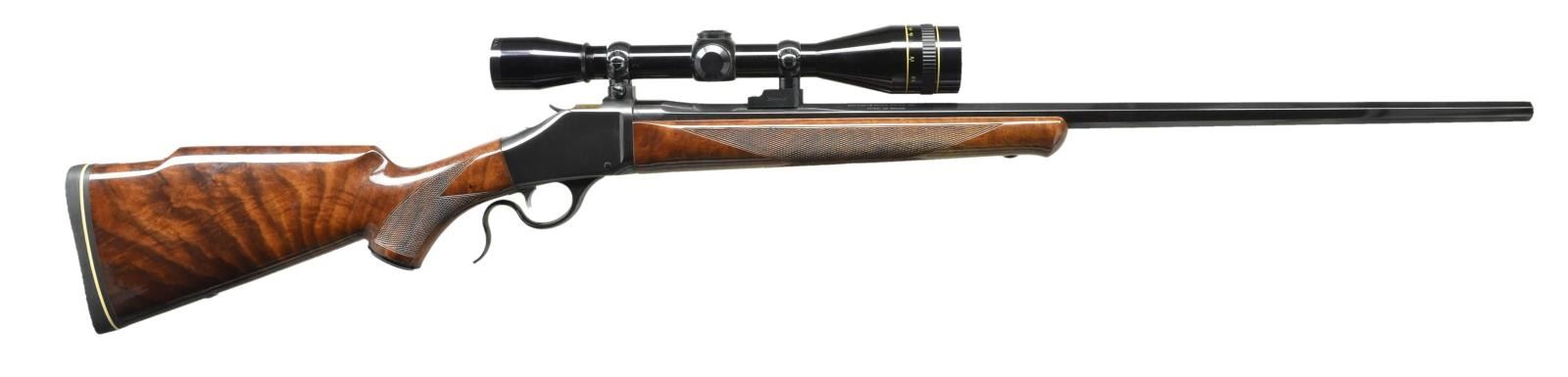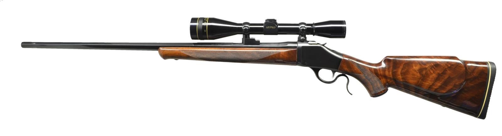 Cal. 6mm Rem. S# W5770634. Bbl. 26" tapered octagon without sights. Leupold 8X gloss finished scope with AO and tapered crosshair reticle on Browning 2 piece mounts. High wall single shot action. Blue finish. Schnabel tipped forearm and Monte Carlo cheekpiece stock of gloss finished fancy walnut with cut checkering. Features include plastic grip cap with stainless oval nameplate on bottom, Pachmayr flush mount swivel bases and Browning solid black rifle pad. Approx. 24,000 mfg. in Japan 1973-1982. CONDITION: near excellent retaining over 98% wood and metal finish. Stock shows a few small marks. Plastic grip cap has a small crack. Bright near excellent bore. Scope has bright optics. (22-2736/DS). MODERN. $1,400-1,800.