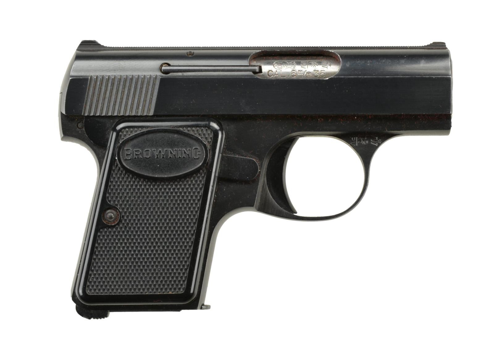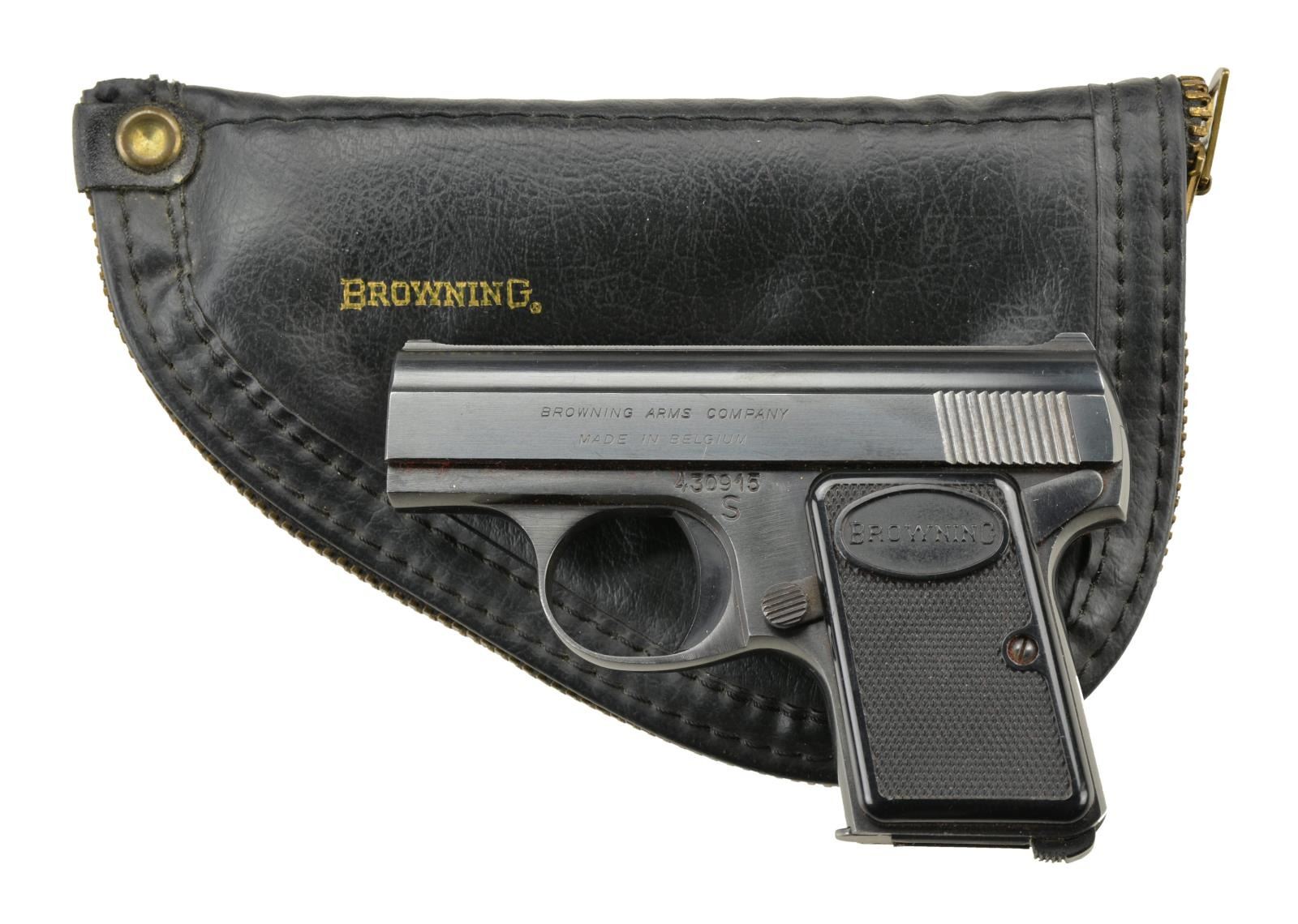 Cal. 25 ACP. S# 430915. Bbl. 2" w/ Belgian proofs. Mfg. 1968 in Belgium having BAC marked slide. Checkered Browning logo black plastic grips. MAGS: 1 FN marked 6 rd. UNATTACHED ACCESSORIES: factory zippered pouch. CONDITION: all aspects near excellent including bore & grips. (22-2654/NW). CURIO. $400-600.