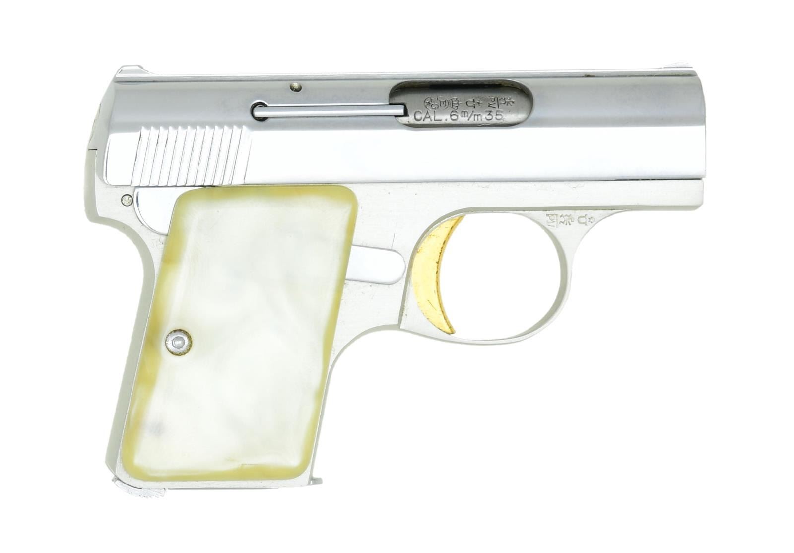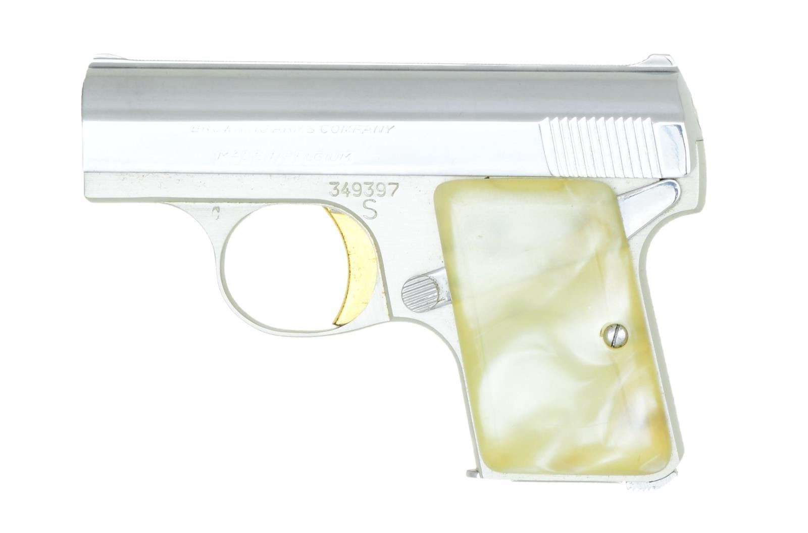 Cal. 25 ACP. S# 349397. Bbl. 2". Low profile sights. Bright chrome-finished slide. Slide markings are faint and slide may possibly be refinished. Satin duraluminum frame. Gold trigger. Mfg. 1966. Pearl-style grips. MAGS: 1-6 rd. FN marked. UNATTACHED ACCESSORIES: Browning leather softcase. CONDITION: all aspects rate very good or better with some light handling & operational wear. (23-6990/MJC). CURIO. $400-600.