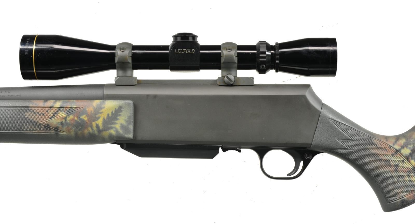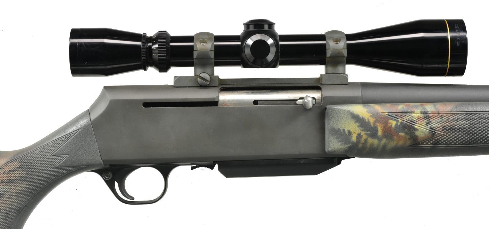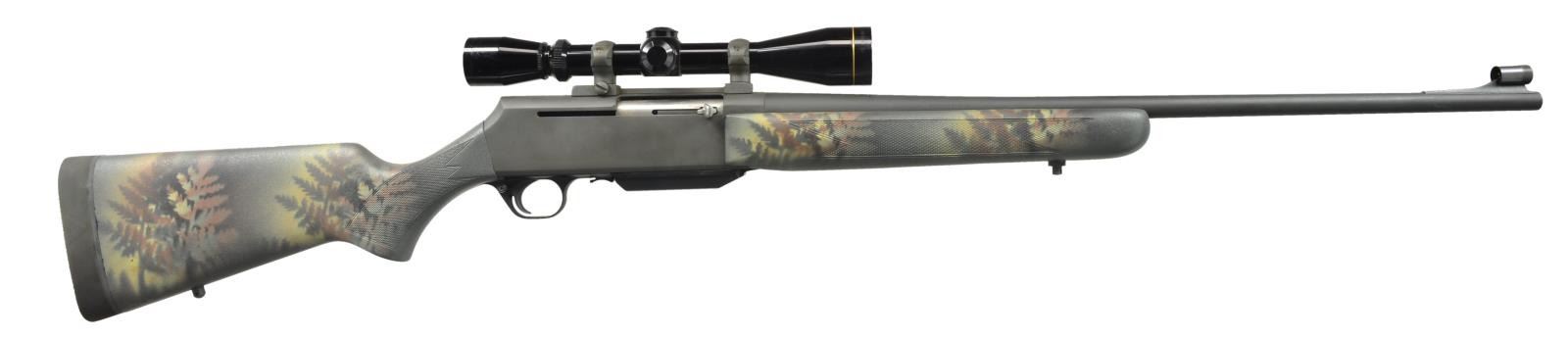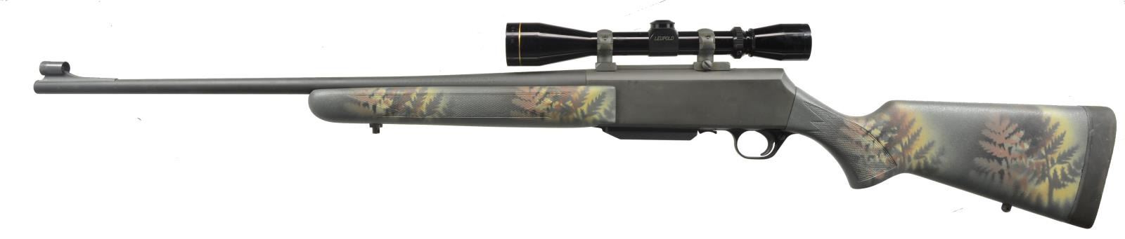 Cal. 338 Win. Mag. S# 137NM08838. Bbl. 24" w/ hooded ramp bead front sight w/ replacement hood. Rear sight is removed. VARI-X IIc 3-9x40 gloss finished scope w/ duplex reticle on 1 Piece Leupold mt. Bbl. & action have custom matte gray finish. Bell & Carlson fiberthane synthetic stock & forearm w/ camo finish & swivel bases. LOP: 14 5/8" over a solid black pad. 1990 Mfg. MAGS: 1 detachable 3 rd. held inside hinged floorplate. CONDITION: 99% matte metal finish w/ faintly visible S#. Stock has very good finish. Bright near excellent bore. Scope has bright optics. (20-2884/DS). MODERN. $500-800.