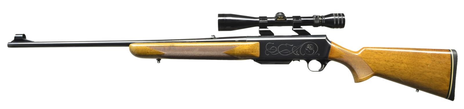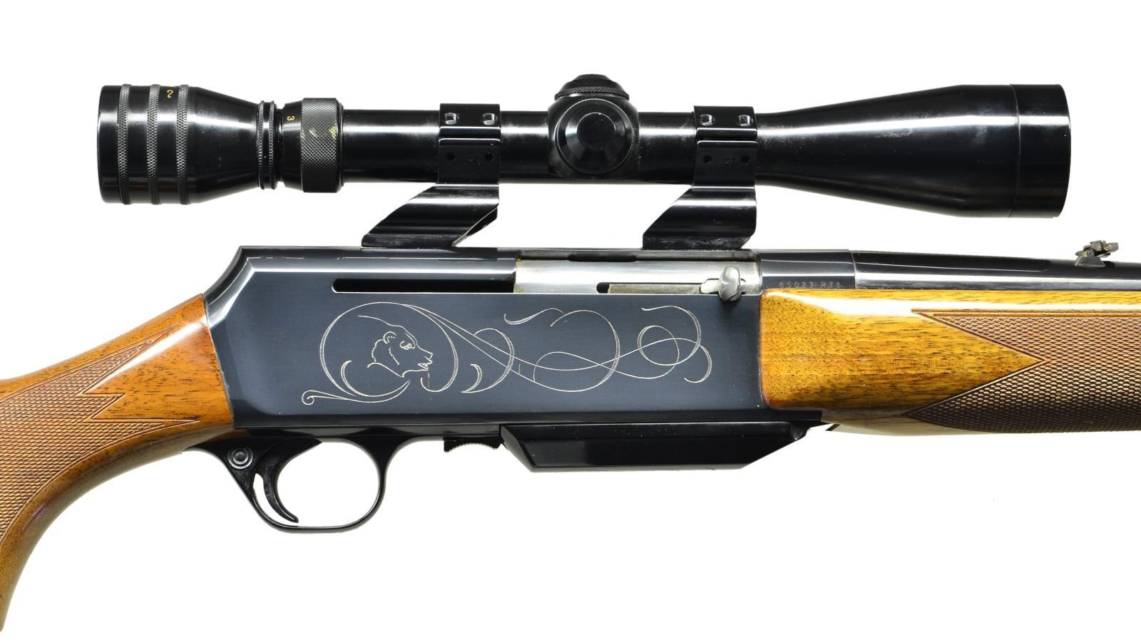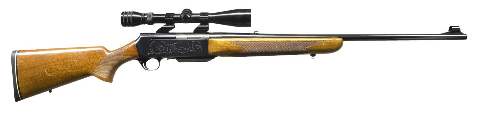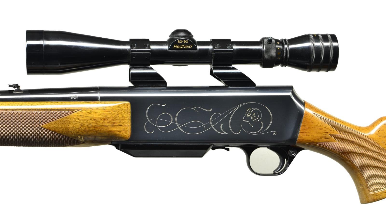 Cal. 300 Win. Mag. S# 85023M71. Bbl. 24" with hooded ramp bead front sight and folding leaf rear sight. Redfield 3-9X40 gloss finished scope with duplex reticle on Weaver see through mounts. Action has tasteful open pattern engraving featuring a bears head on right side and bighorn sheep on left. Blue finish. Forearm and pistol grip walnut stock have gloss finish, hand checkering and swivel bases. LOP: 13 3/4" over original solid black Browning pad. 1971 Belgium mfg. MAGS: 1 - 3 round detachable held inside hinged floorplate. CONDITION: over 98% original blue. Original wood finish shows light crazing with scattered scratches, marks and small dents. Bright near excellent bore. Scope has clear optics. (22-3924/DS). CURIO.$700-1,000.