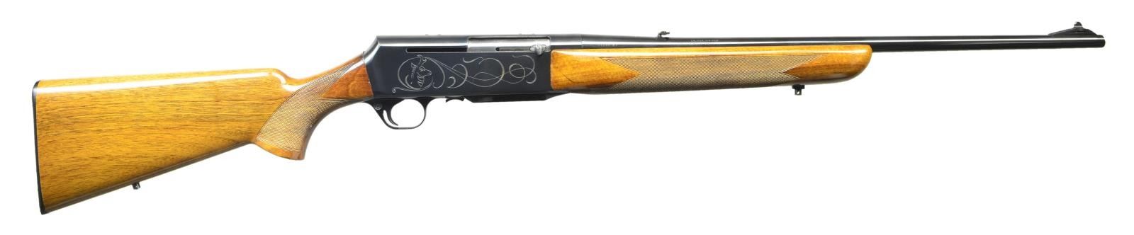 Cal. 308 Win. S# 11718M7. Bbl. 22". Belgian mfg. Grade II BAR with blued barrel and receiver and engraved receiver with Buck profile. Ramp front sight with blade and fold down rear sight along with 4 drilled and tapped holes atop the receiver currently filled with plug screws. Stock and forend have sling swivel studs and a factory buttplate. CONDITION: metal retains about 93% original finish showing scattered scratches and dings. Checkering shows light compression to the points and some light ingrained dirt. Wood retains strong factory finish with some scattered scratches. Bore is very good bright and strong (22-3657/CW). CURIO. $600-900.