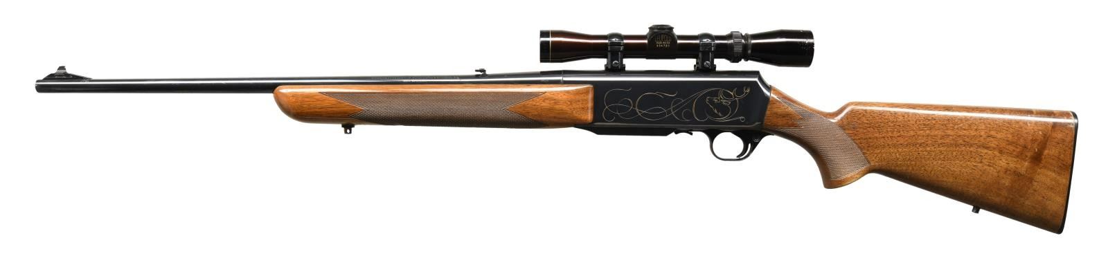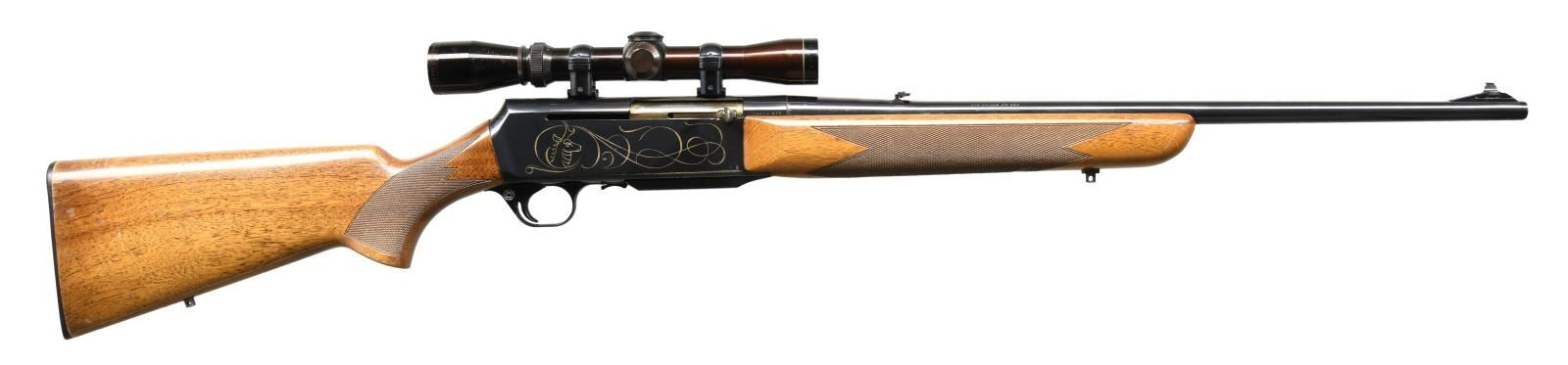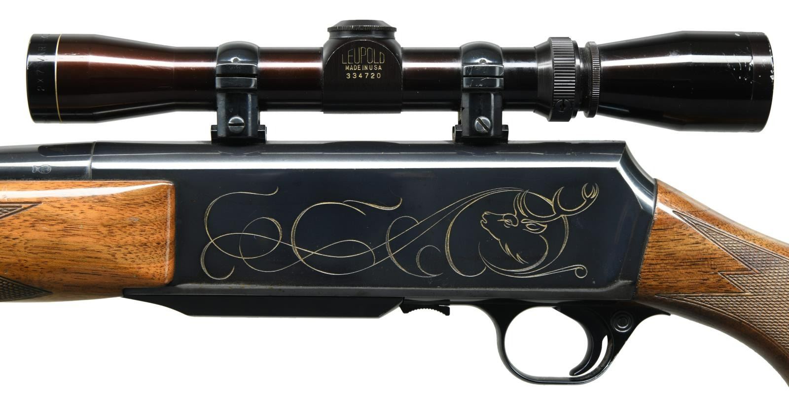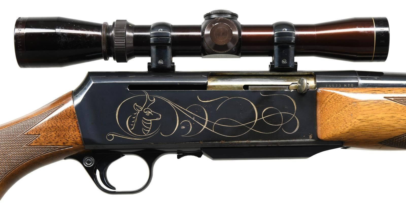 Cal. 270 Win. S# 75573M70. Bbl. 22". Mfg. 1975 in Belgium. Ramped gold bead front sight. Folding leaf rear sight. Receiver mounted Leupold 2-7x power scope w/ fine crosshair reticle & fair optics that have a slight green tint. Rear of scope exhibits some chipping & flaking. Receiver has big game engraving on both sides. Checkered pistol grip walnut stock w/ factory buttplate. Bottom mounted sling studs. UNATTACHED ACCESSORIES: factory manual. CONDITION: stock set retains most of its factory finish w/ some light flaking, light dings & handling wear. Metal retains 90% original blue w/ some edge wear on bottom of receiver, scattered oxidation spots & light scratches Very good bright bore. (23-1712/MJC). MODERN. $700-1000.