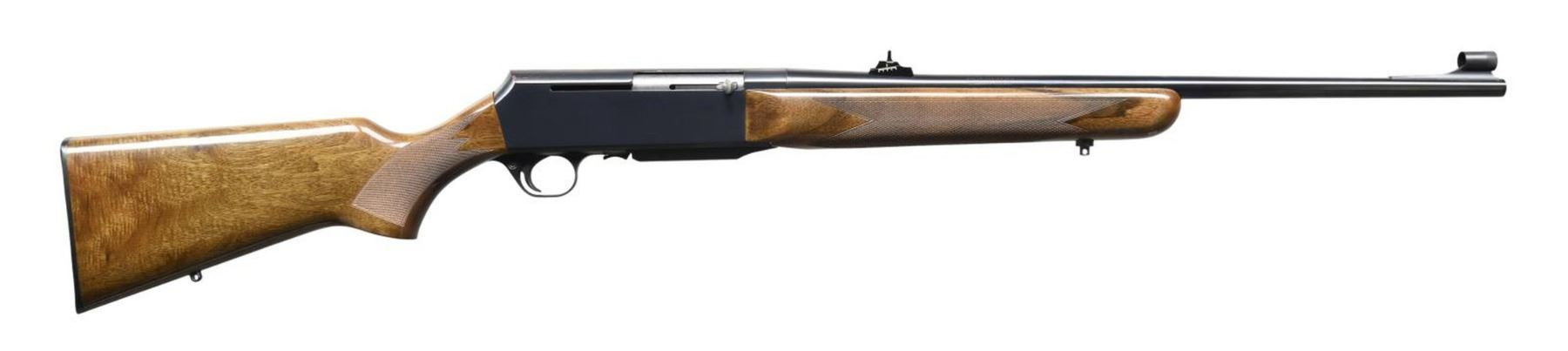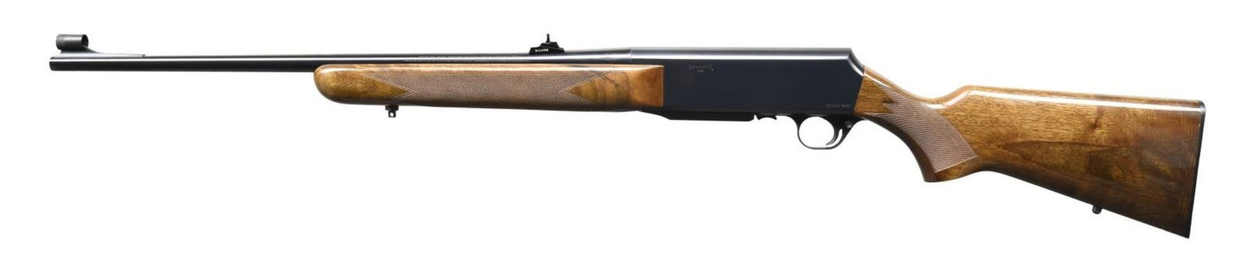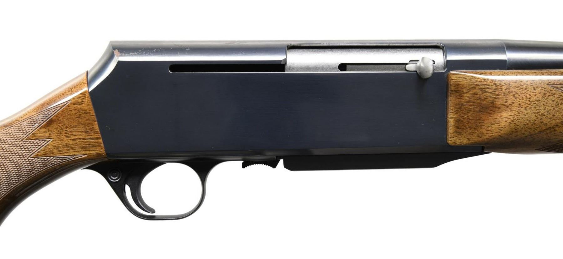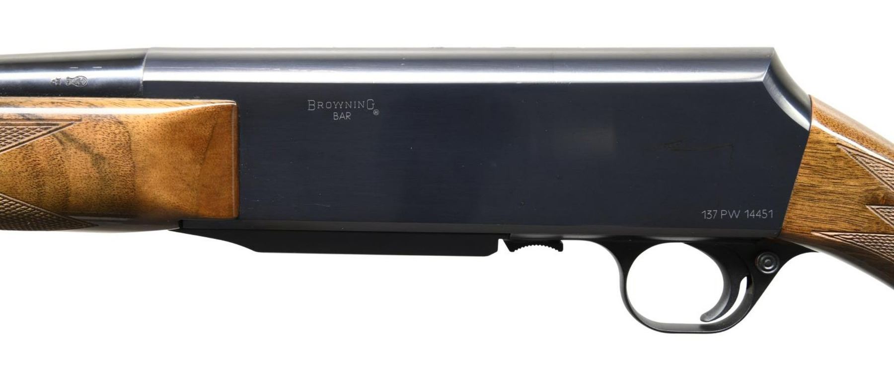 Cal. 308 Win. S# 137PW14451. Bbl. 22 1/2". BAR semi-automatic rifle mfg. in Belgium by Fabrique Nationale, assembled in a Portugal, and imported/retailed by Browning Arms Co. Left side of bbl. is marked with Browning's importer and FN's mfg. information, followed by Belgium proofs, with the cal. designation on the right. Left side of receiver is marked "BROWNING / BAR", as well as with serial number. Metal components exhibit a blue finish with the aluminum trigger guard and hinged floorplate exhibiting a matte black finish. Checkered wood, pistol grip buttstock and forend. Ramped and hooded brass beaded blade front sight with William's U notch rear sight. CONDITION: metal components retain the majority of their original factory finishes, with the receiver exhibiting some scattered handling marks and a couple small spots of mild surface oxidation. Mirror bore, retaining well defined rifling throughout. Wood furniture is very good overall. (24-645/MLW). MODERN. $500-700.