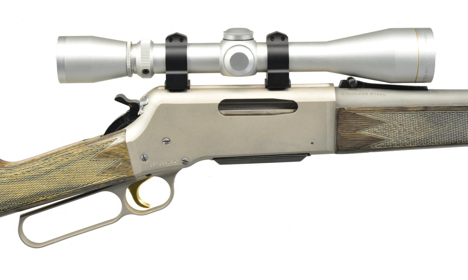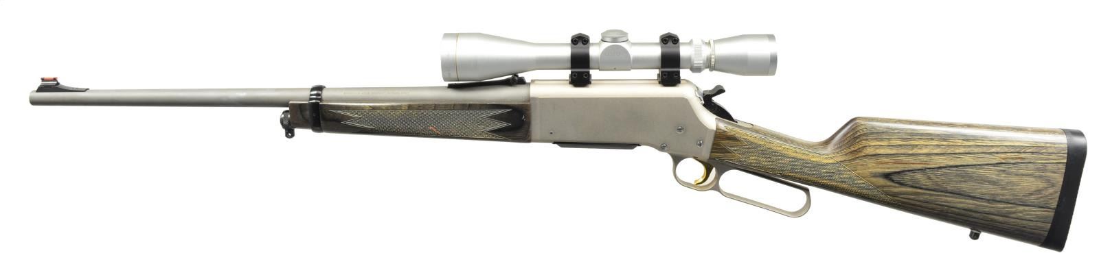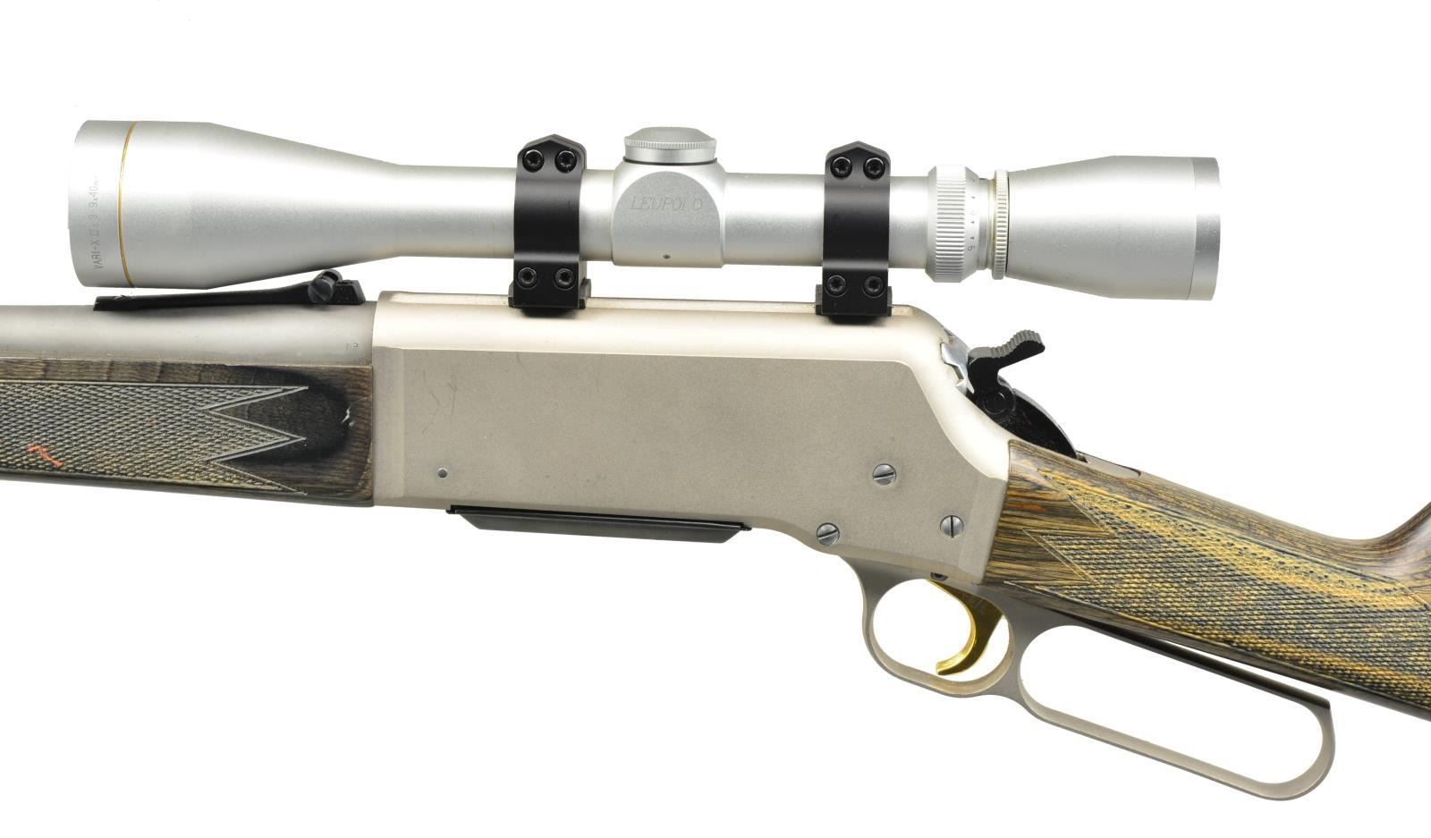 Cal. 358 Win. S# 06048MV341. Bbl. 20" stainless steel w/ ramp mounted fiber optic front sight & adj. rear sight. Matte finished alloy action w/ gold plated trigger. Green gray laminated wood stock w/ cut checkering, swivel bases & solid black browning pad. Leupold VARI-X IIC 3-9x40 matte silver finished w/ duplex reticle. 2005 Mfg. MAGS: 1 detachable 3 rd. CONDITION: 98% metal finish showing light staining & scuffs. Wood shows a few scratches or sm. marks. Bright near excellent bore. Scope has bright optics. (20-2885/DS). MODERN. $700-1,000.