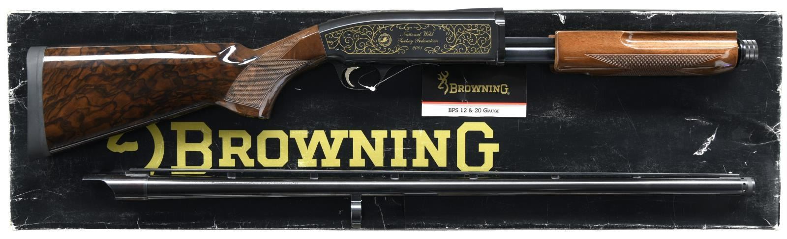 PUMP ACTION SHOTGUN WITH MATCHING FACTORY BOX. Cal. 12 GA, 2 3/4" or 3". S# NWTF011644. Bbl 28". BPS pump action shotgun manufactured by Miroku and imported by Browning Arms Company of Morgan, UT for the 2001 National Wild Turkey Federation. The left side of the receiver features a scene of 4 gold inlaid turkeys surrounded by a gold line border, with the right side bearing a matching gold line border, surrounding a National Wild Turkey Federation medallion and "National Wild/ Turkey Federation/ 2001". Barrel features a vent rib and brass bead front sight. Metal components exhibit a blued finish, with the trigger being gold plated. Furniture is comprised of a checkered wood buttstock and pump. UNATTACHED ACCESSORIES: matching factory cardboard box containing its styrofoam insert. CONDITION: excellent, with metal components retaining bountiful amounts of their original factory blue finish, exhibiting areas of what appears to be original factory grease overall, with a few small spots of light surface oxidation on the left side of the action bar. Bore is bright, exhibiting a layer of factory grease throughout. Wood furniture shows a few light superficial marks from handling, but is otherwise fine. Box shows some exterior wear, but otherwise remains sturdy and serviceable. (23-2356/MLW). MODERN. $500-800.