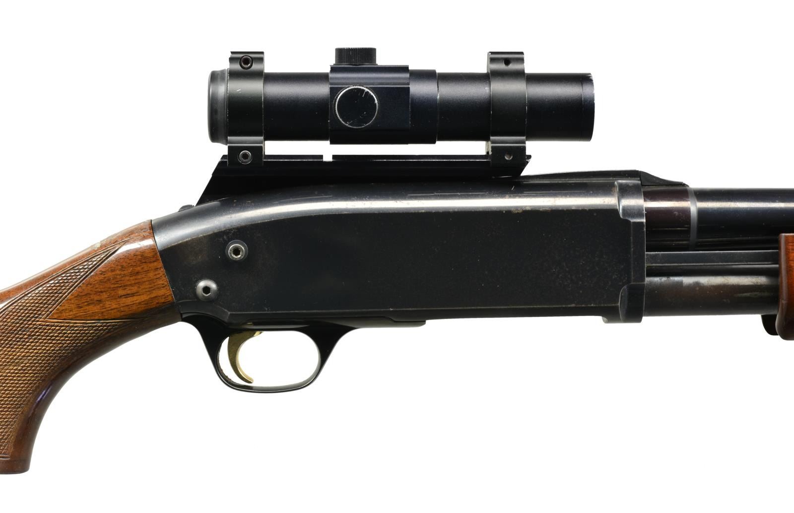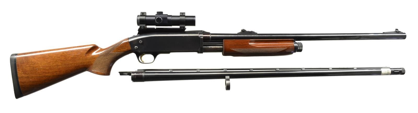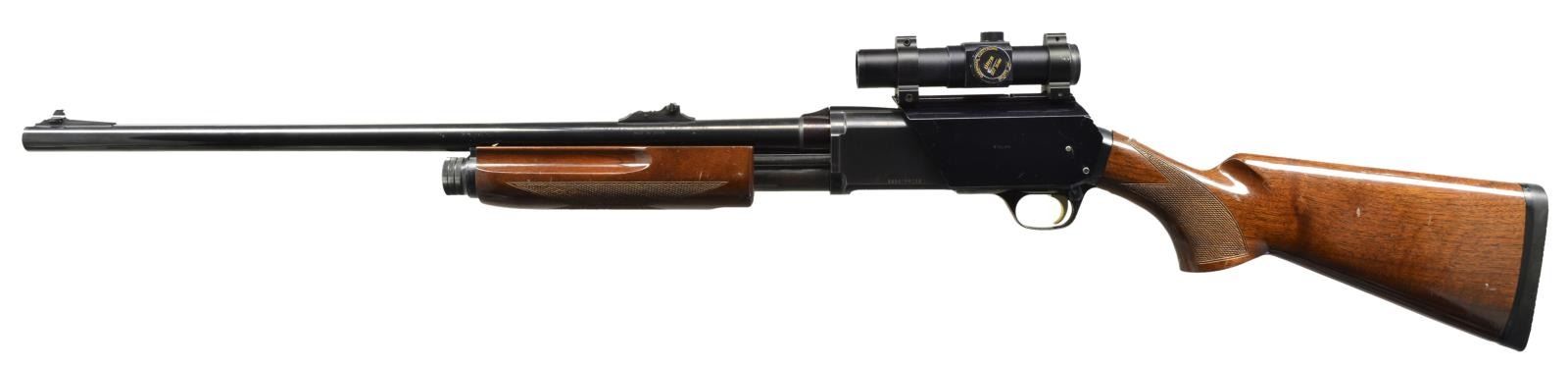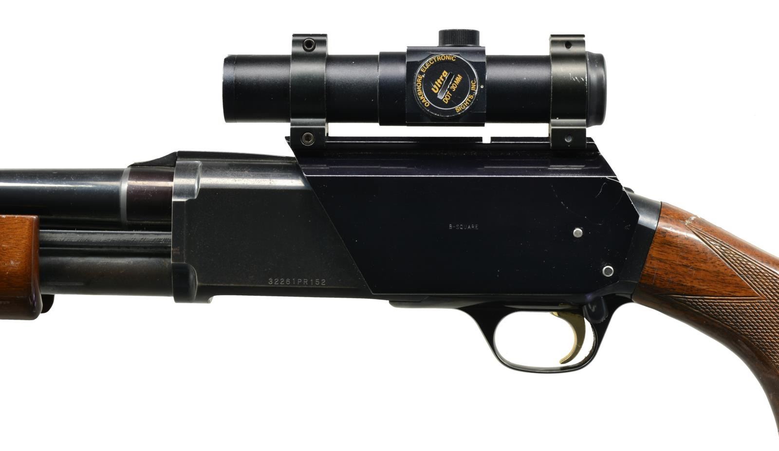 Cal. 12 Ga., 2 3/4" & 3". S# 32261PR152. Bbl. 24" smooth bore w/ rifle sights. Bottom ejection action w/ gold finished trigger. Oakshore electronic Ultra red dot 30mm sight on B-Square mt. Checkered walnut forearm & pistol grip stock w/ original recoil pad. UNATTACHED ACCESSORIES: 30" VR bbl. fitted for Invector chokes includes factory IC choke, Primos Jelly Head Turkey choke & Browning wrench. CONDITION: 80% blue showing edge wear & spots of fading. Stock shows numerous dents & handling marks. Bore shows areas of plastic fouling. Sight has clear optics. (20-1507/DS). MODERN. $300-500.