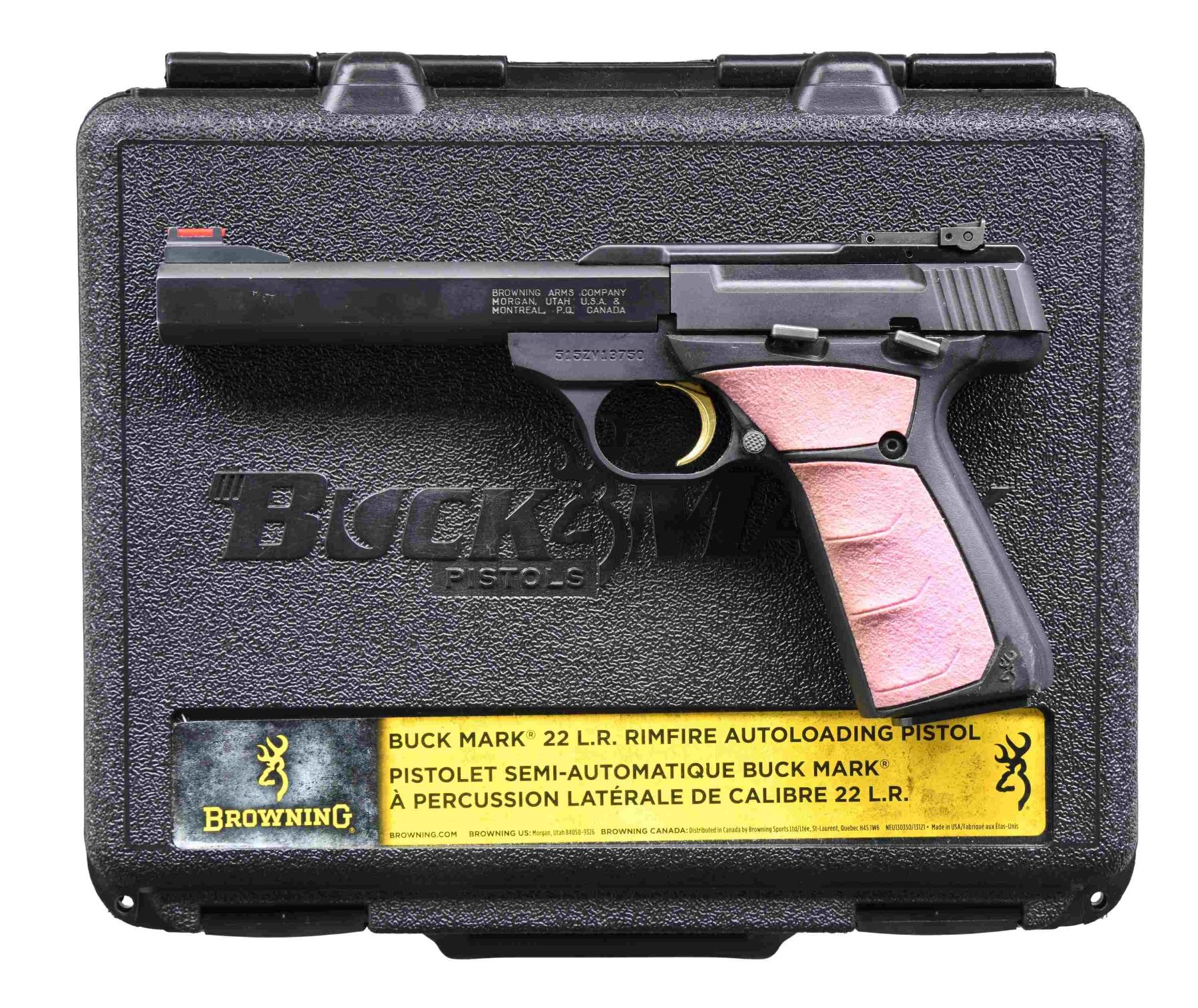 MATCHING FACTORY HARD CASE. Cal. 22 LR. S# 515ZV13750. Bbl. 5 1/2". Buckmark semi-automatic pistol mfg. by Browning in 2015. Left side of the bbl. is marked with Browning's mfg. information, with the cal. and model designations marked on the right. Left side of the frame is marked with the S#. Bbl. exhibits a dual-tone blue finish, with the slide exhibiting a matte blue finish. Aluminum frame exhibits a matte black finish. Frame is mounted with 2-piece textured black and red polymer and rubber grips. Red fiber optic front sight, with square notch rear sight. MAGS: 1 10-rd. UNATTACHED ACCESSORIES: matching factory hard case. CONDITION: good, with metal components retaining the majority of their original factory finishes, exhibiting some light edge wear, as well as some superficial handling marks overall. Mirror bore, exhibiting strong rifling throughout. Chamber exhibits a small burr from prior dry firing. Grips are good, with the textured red rubber exhibiting fading and discoloration. (24-7028/MLW). MODERN. $200-400.