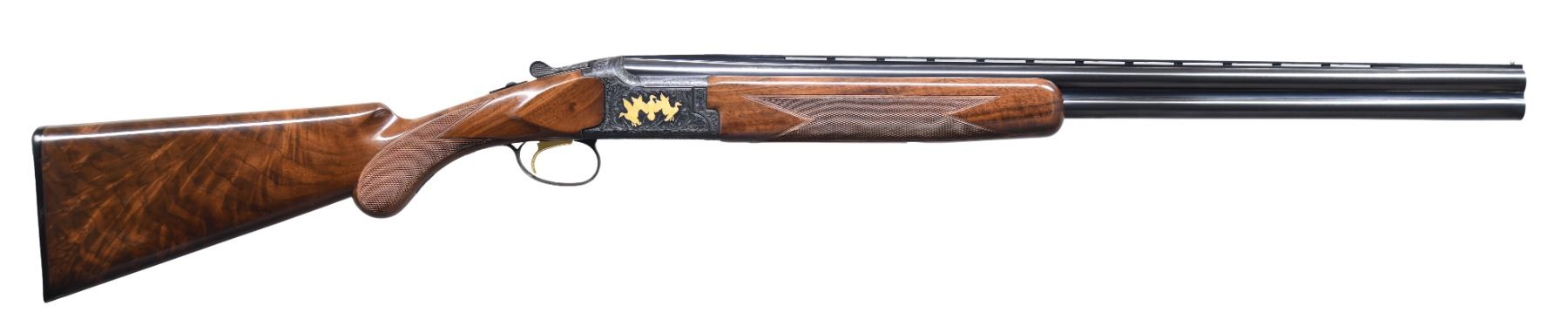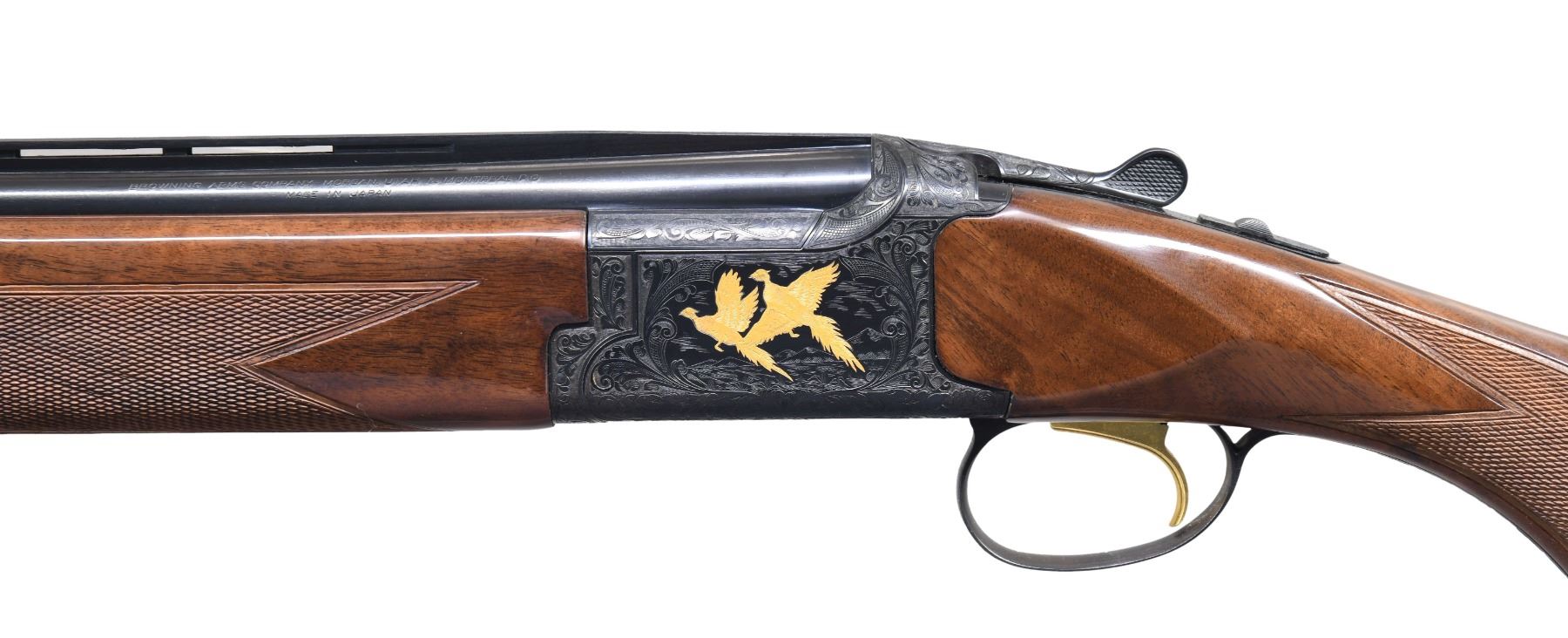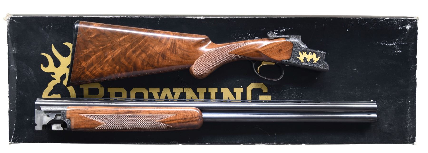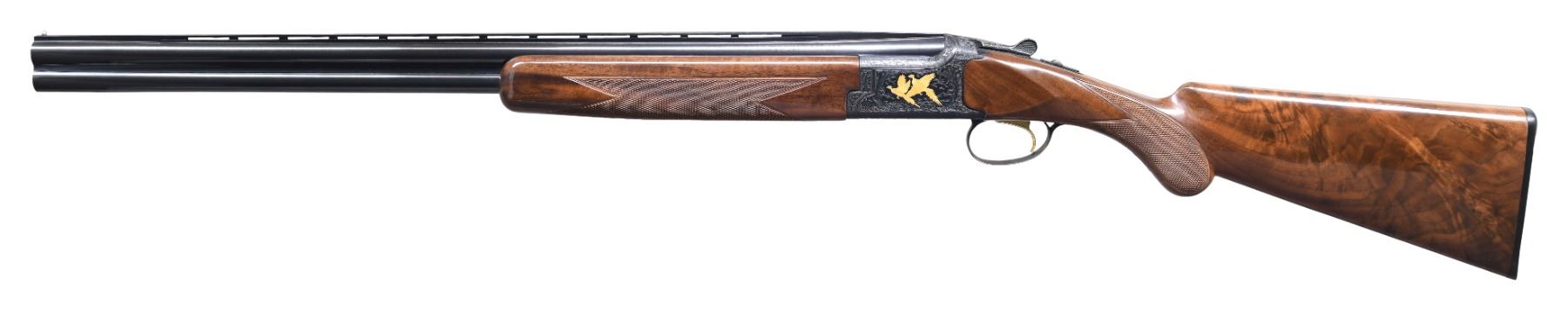 Cal. 20ga 2 3/4" & 3". S# 24253PN963. Bbl are 26" vent rib with Invector chokes. IC, MOD, and FULL choke tubes are included. Blued boxlock action has Grade 6 ornamentation. Right side scene features three gold plated mallard. Left side scene has two flying pheasants. Floor plate has a gold setter and trigger guard shows a flying gold plated quail. Scenes are surrounded by full coverage vine type foliate scroll that extends to forearm iron and breech section of bbls. Lightning forearm and round knob pistol grip stock of gloss finished fancy walnut with cut checkering. LOP: 14 1/8" over original buttplate. WEIGHT: 6lb 8.8oz. UNATTACHED ACCESSORIES: original foam lined black box containing extra choke and wrench. CONDITION: near excellent retaining 99% wood and metal finish. Stocks show a few very small marks. Bright near excellent bores. (25-1469/DS). CURIO. $3,000-5,000.