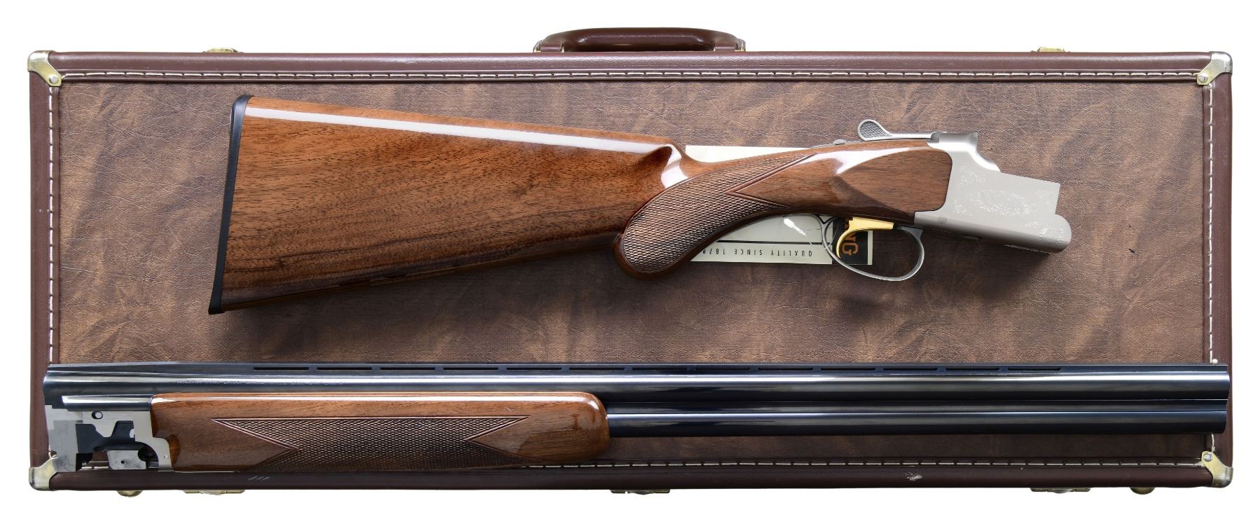 SHOTGUN. Cals. 28 ga. 2 3/4" & 20 ga. 2 3/4" & 3". S# 65572MM131. Both Bbls. 27" vent rib w/ Invector Interchangeable chokes & steel front beads. IC, Mod & Full choke tubes for each gauge are included. Grayed alloy receiver w/ gold plated feather on the floorplate. Sides have moderate coverage of scroll ornamentation. Single lightning forearm & round knob pistol grip stock of checkered gloss finished walnut. LOP: 14" over original buttplate. DAC: 1 1/2". DAH: 2 1/2". Neutral cast. WEIGHT w/ 20 ga. bbls: 5 lbs, 13 oz. Introduced in 2012. UNATTACHED ACCESSORIES: Browning two barrel set hardcase. Case contains spare chokes, choke wrench, owner's manual, trigger lock, 20 ga. snap caps & case keys. CONDITION: near new, retaining nearly all wood & metal finish, showing small marks in the wood. All bores are bright & near excellent. (25-747/DS). MODERN. $2,500-3,500.