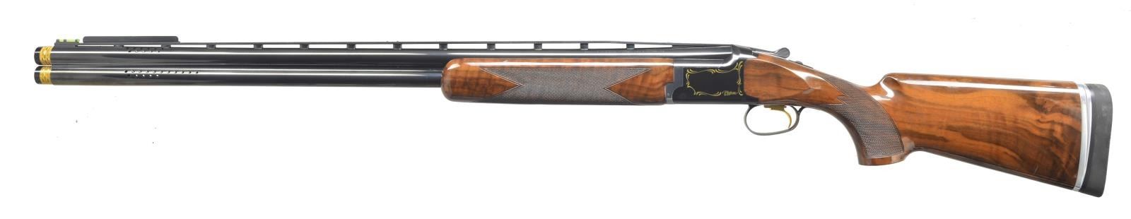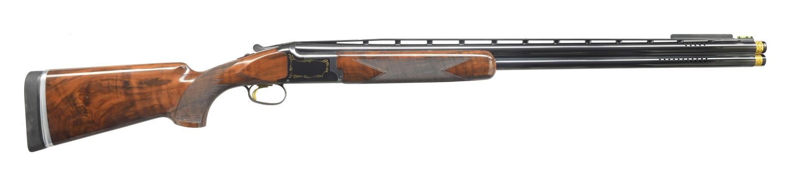 Cal. 12 Ga., 2 3/4". S# 05267NWT13. Bbls. 30" w/ raised ventilated rib are ported & fitted w/ Invector plus choke tubes (2 tubes in gun marked "IC" & "IM". A left eye blinder is fitted behind green "glow-worm" bead. Browning information & "MADE IN JAPAN" are on breech end of top bbl. Blued O/U action has gold plated single selective trigger has loops of incipient gold scroll on sides surrounding pigeon. Bottom also marked in gold "BROWNING", "Sporting Clays", "Pigeon". Well marbled & figured European walnut extreme pistol grip buttstock measures 14 1/2" over black "LimbSaver" pad on adjustable plate. Point pattern checkering is at grip. Matching 1 piece forend has Deeley type release. DAH: 1 7/8". DAC: 1 1/2". Weight: 8 lbs 3 oz.. CONDITION: fine w/ evidence of limited use. Bbls. show some light marks. Action w/ nearly all of its blue, silvered behind trigger guard. There is considerable silvering on forend latch & rear points of iron. There are only a few scattered marks in gloss finish of stocks. Checkering lightly worn. Bores are shiny. Action is tight. Mechanically fine. PROVENANCE: Collection of Alan Bradley Shepherd. (20-4001/MGM). MODERN. $1,000-1,500.