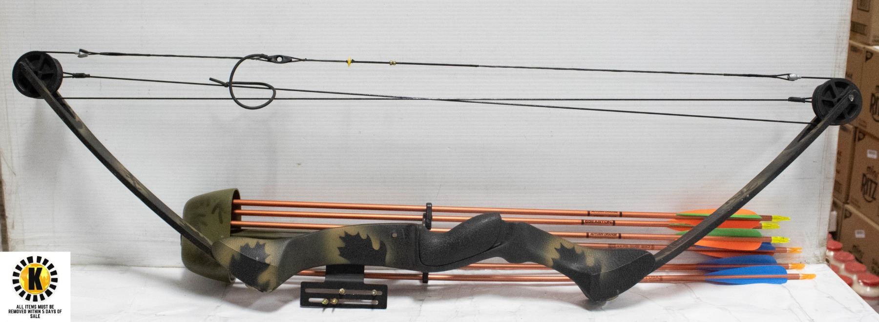 WITH ALUMINUM TARGET ARROWS, SET TO 50LBS DRAW AND ADJUSTABLE TO 70LBS, COMPLETE WITH PIN SIGHT AND QUIVER, *WILL REQUIRE NEW ARROW REST **ALL ITEMS MUST BE REMOVED BY 5PM SATURDAY, AUGUST 26TH 2023. ALL REMAINING ITEMS WILL BE SUBJECT TO A $6.00 PER DAY STORAGE CHARGE. ANY ITEMS REMAINING AFTER MONDAY, SEPTEMBER 11TH, 2023 WILL BE CONSIDERED FORFEITED. NO REFUNDS WILL BE ISSUED FOR FORFEITED ITEMS. TO SCHEDULE A PICK UP APPOINTMENT CLICK HERE