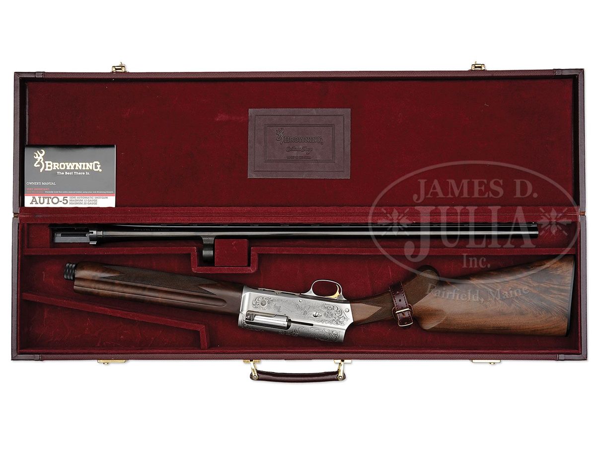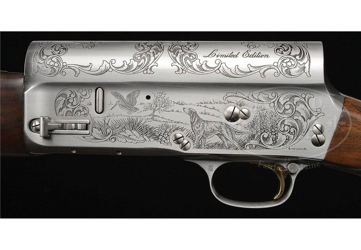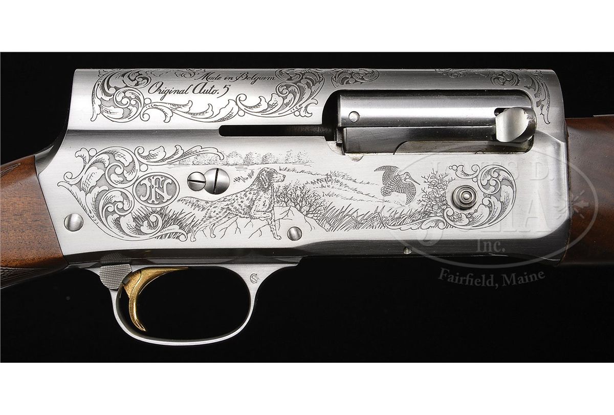 SN 161CS01457. Cal. 20 ga. 3" Chambers. 27-1/2" Ventilated rib bbl is choked modified, and has all correct markings either side of rib. Coin finished action is engraved with large open scroll, surrounding vignettes of setters and flushing woodcock on both sides. FN logo is at rear of scene on right side of action. Top of action is engraved "Limited Edition Made in Belgium" and "Original Auto 5" which is surrounded by more scroll. Stocks are of flame figured American walnut. Drop at heel: 2-5/16", drop at comb: 1-9/16". Weight: 7 lbs. 8 oz. LOP: 14-1/4". Dark russet leather Browning case by Emmebi is lined in burgundy felt, and has dark brown Browning Custom Shop label on lid, and contains identification certificate, owner's manual, and the orig wrapping tissue. Also accompanied by its orig Browning box with correct end label with SN. CONDITION: Essentially as new. Does not appear to have been fired, since proof, with only very light scratches on bbl extension. Case is excellent with some minor scuffs. Interior has compressions. Box is fine with considerable chipping and some tape. 4-49037 MGM212
