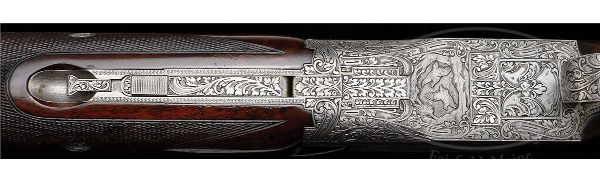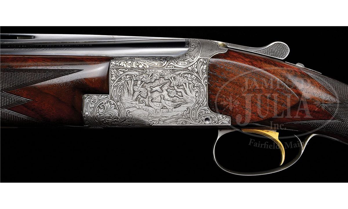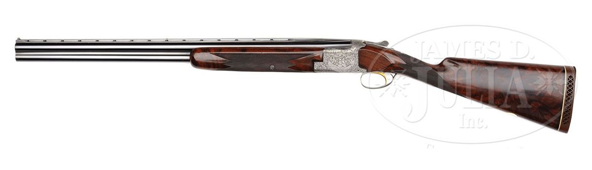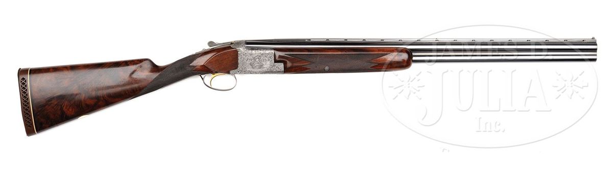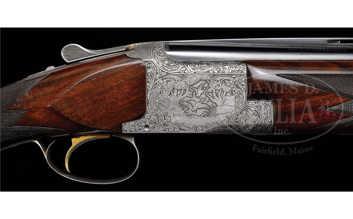 SN 91294. (1961) Cal. 12 ga. 26-3/8" Bbls with matted, ventilated rib, are engraved with Browning St. Louis and Montreal addresses, along with "Special Steel - 12 Ga - Shells 2-3/4" on top left. Top right is stamped with patent numbers and "Made in Belgium". Coin finished, superposed action, fitted with single selective, gold-plated trigger, is engraved with Vranken inspired scrolled acanthus with strap work highlights framing vignettes of game birds in woodland settings; Five pheasant grace the left side; four ducks in marsh are on right; a pair of quail wing across bottom. A pair of rabbits are on trigger guard bow. Engravers signature "H. Dewil" is on right side under scene. Beautifully flame figured American walnut straight grip buttstock measures 14-3/8" over leather-faced, open-sided, brown, white line pad, and has point pattern checkering with double line border at grip and vacant gold oval on toe line. Bbls are fitted with small rounded one piece forend. Bore diameter: top -.724, bottom -.722. Bore restrictions: top -.005 (Skeet), bottom -.003 (Skeet). Wall thickness: top-.032, bottom -.035. Drop at heel: 2-1/4", drop at comb: 1-1/2". Weight: 7 lbs. 10 oz. LOP: 14-3/8". CONDITION: Excellent. Bbls retain approx 95% orig blue with some minor light scratches and silvering around muzzles. Action retains nearly all its orig French gray, darkened somewhat over the years. Stocks retain most of their orig finish with some areas worn through especially around grip, with numerous light marks, checkering slightly worn and dirty. Action is tight. Ejectors are in time. Trigger works. 4-48703 MGM92