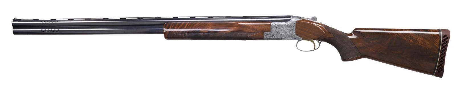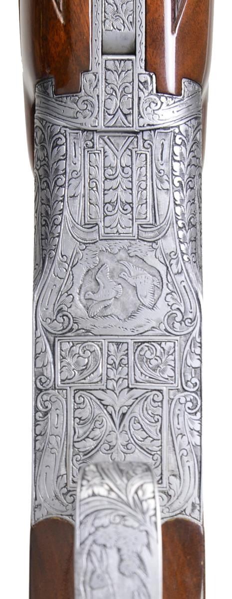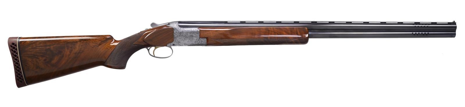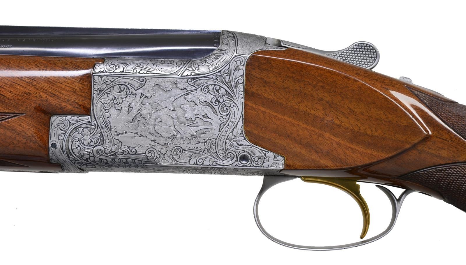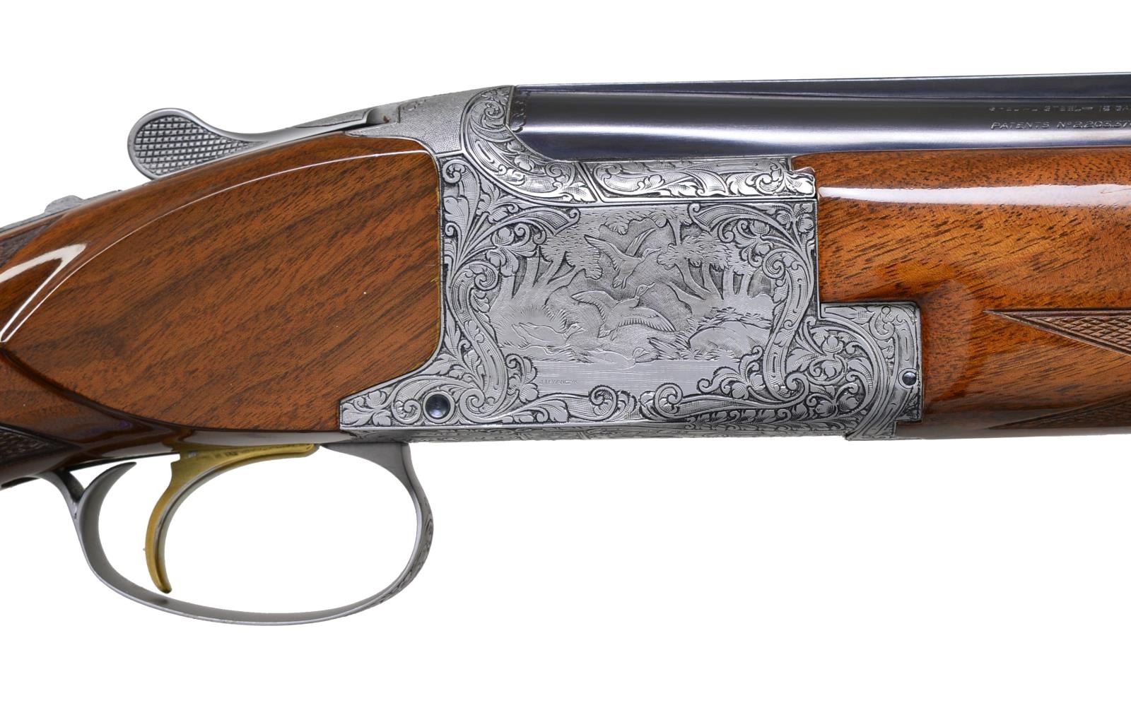 STYLE O/U SHOTGUN. Cal. 12 Ga., 2 3/4". S# 20806S70. Bbls. 30" VR ported w/ white target front sight & white mid bead. Fixed Mod. & Full chokes. Satin finished boxlock action w/ Diana grade engraving signed by Master Engraver "J. LEWANCZYK". Engraving features game scenes w/ mallards on right side, pheasants on left side, quail on floorplate & hares on trigger guard bow. Scenes are surrounded by full coverage foliate scroll engraving that continues to forearm iron, top lever & safety. Gold plated SST. Ejectors. Target style forearm & flat knob short tang straight comb trap dimension stock of gloss finished fancy walnut w/ hand checkering. LOP: 14 3/8" over original Browning trap style pad. 1970 Mfg. CONDITION: factory repaired salt era gun inside surfaces of metal retain areas of pitting. 98% Wood & metal finish. Stock shows sm. spots of raised finish around action. Action falls open easily from use. Bright bores w/ lengthened forcing cones. PROVENANCE: From the Frederic W. Thrane Collection. (20-2466/DS). MODERN. $2,500-3,500.