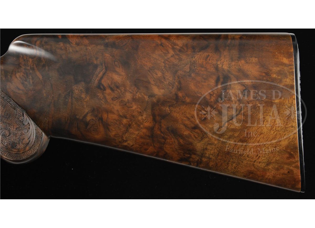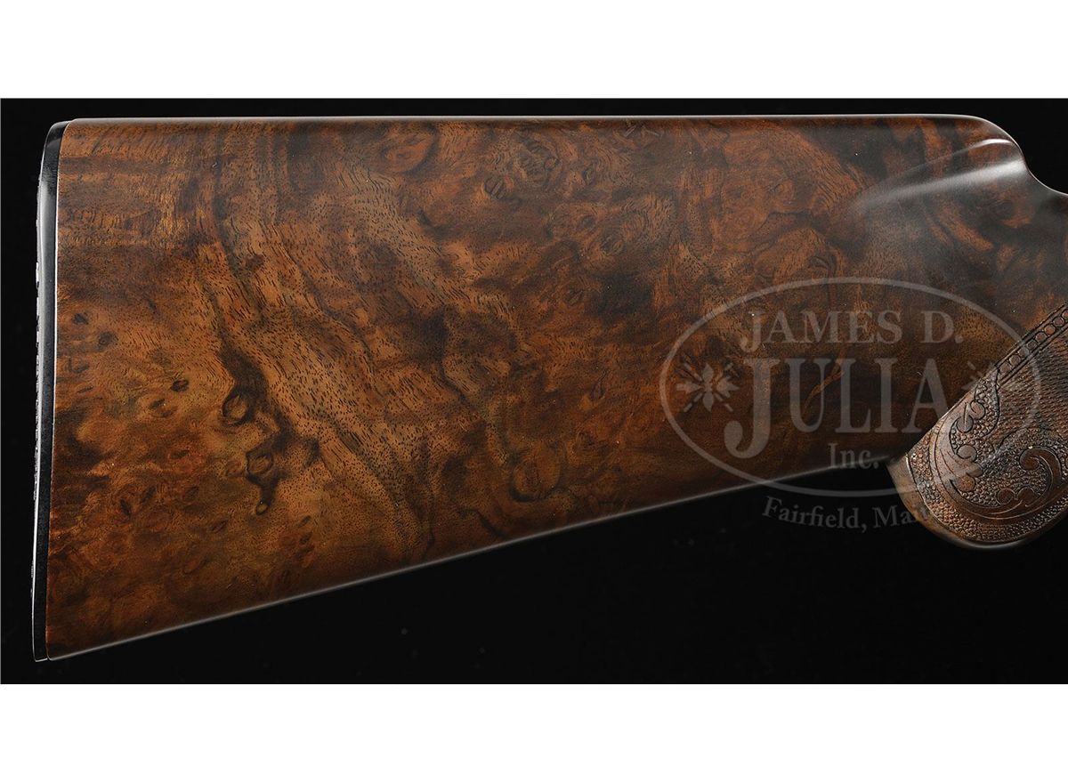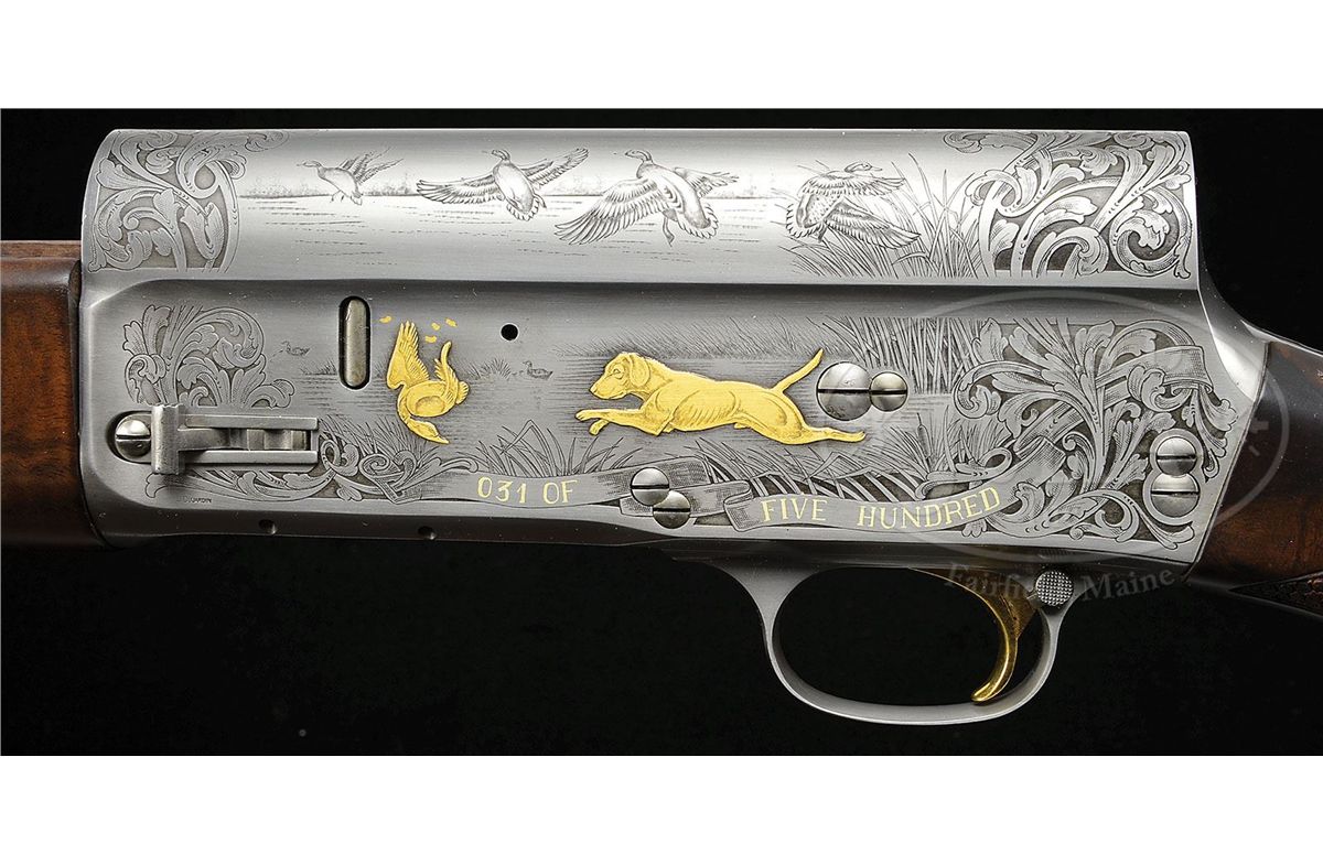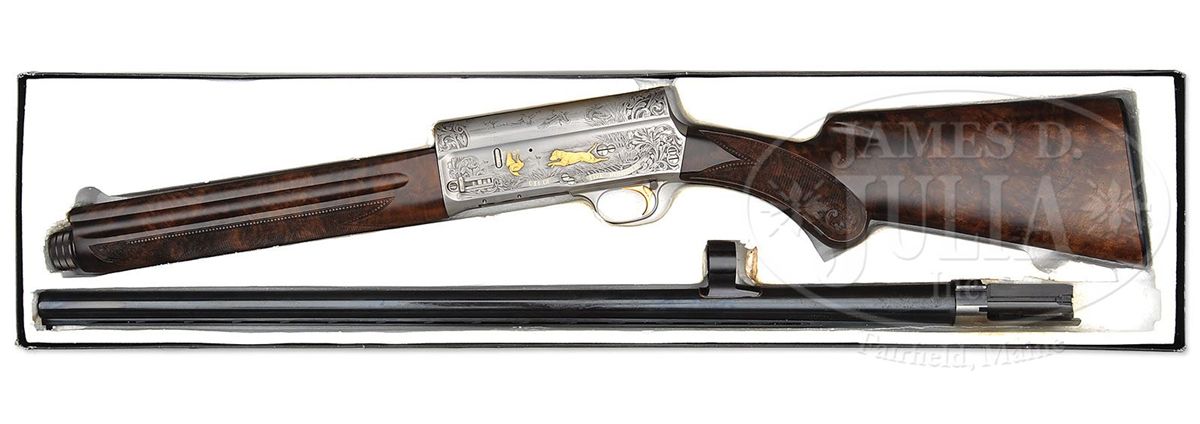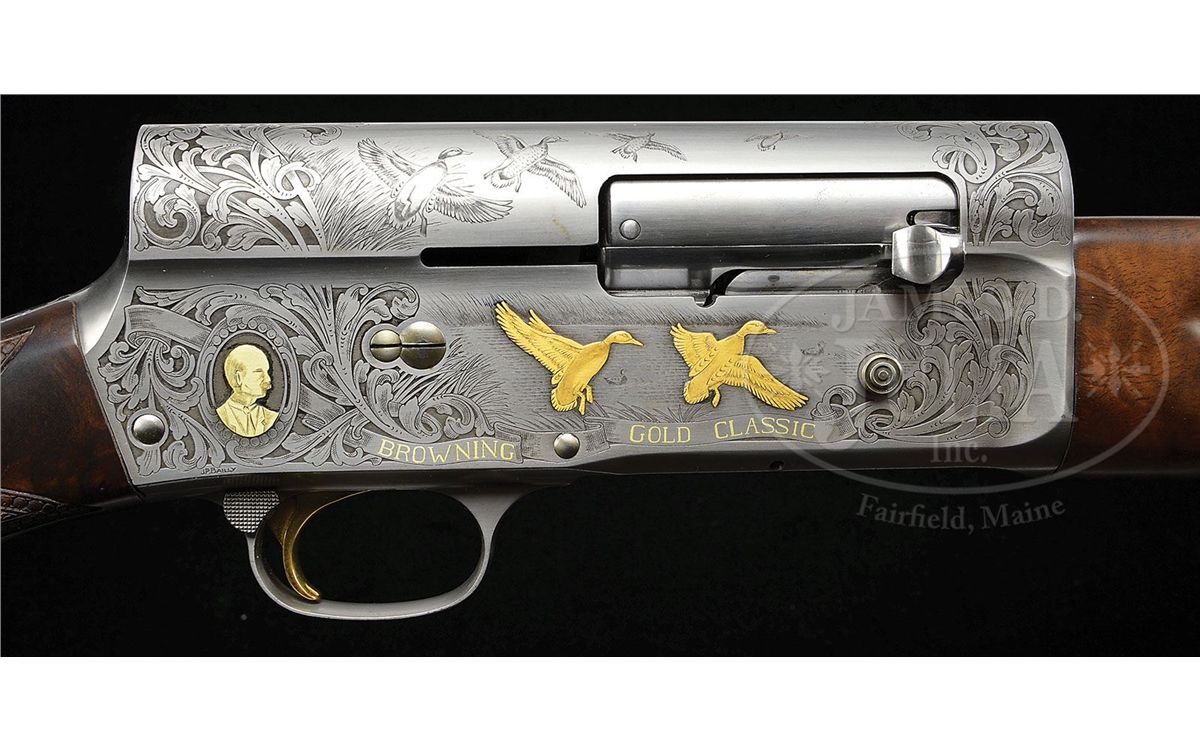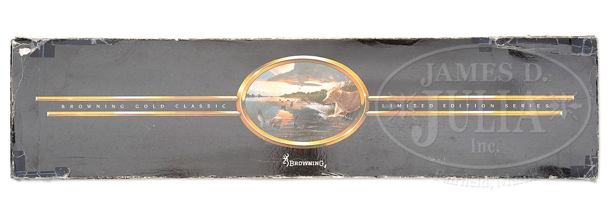 SN 211GC031. Cal. 12 ga. 2-3/4" Chamber. Modified choke. 28" Ventilated rib bbl has usual Belgian Browning nomenclature on bbl. Coin finished action is engraved with large, open, shaded scroll and flocks of ducks as counterpoint to gold inlay of hunting scenes in appropriate backgrounds; a retriever bounds into water after falling duck on left side of action, which is over a riband gold inlaid "031 OF FIVE HUNDRED". Engravers signature "J. Dujardin" is at lower left of scene. Right side depicts a pair of gold inlaid flushing mallards over "BROWNING GOLD CLASSIC" in riband. A portrait of John M. Browning is in oval frame behind sporting scene. Engravers signature "J. P. Bailly" is under portrait. Exceptional burl figured walnut stocks are nicely checkered and have carved, beaded borders and flourishes of scrolled acanthus with stippled background. Drop at heel: 2-1/2", drop at comb: 1-5/8". Weight: 8 lbs. 2 oz. LOP: 14-3/8". Gun comes in its orig black Browning box with black outer slipcover with end label for this particular type of gun, but SN is not printed. Box contains Browning Gold Classic series catalog, and orig wrapping tissue and plastic. CONDITION: As new in box. Gun appears to have been assembled, with some light scratches on bbl extension, but not fired. Box has edges chipped, and reinforced with tape. 4-49036 MGM209