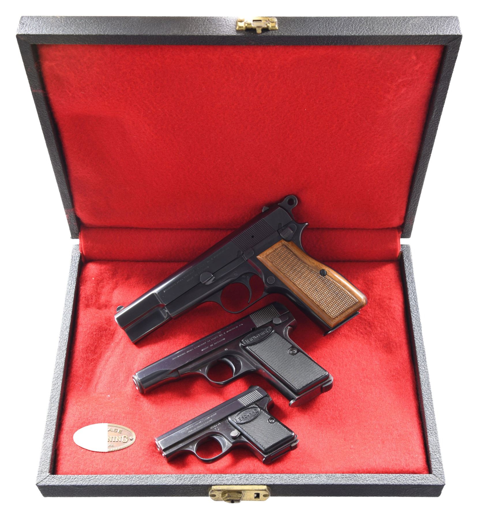 UNATTACHED ACCESSORIES: Browning black presentation box w/ red interior. Also includes operation & care booklet as well as Browning marked black vinyl zipper pouches for all three pistols. ALL CURIO. $2,500-3,500.
