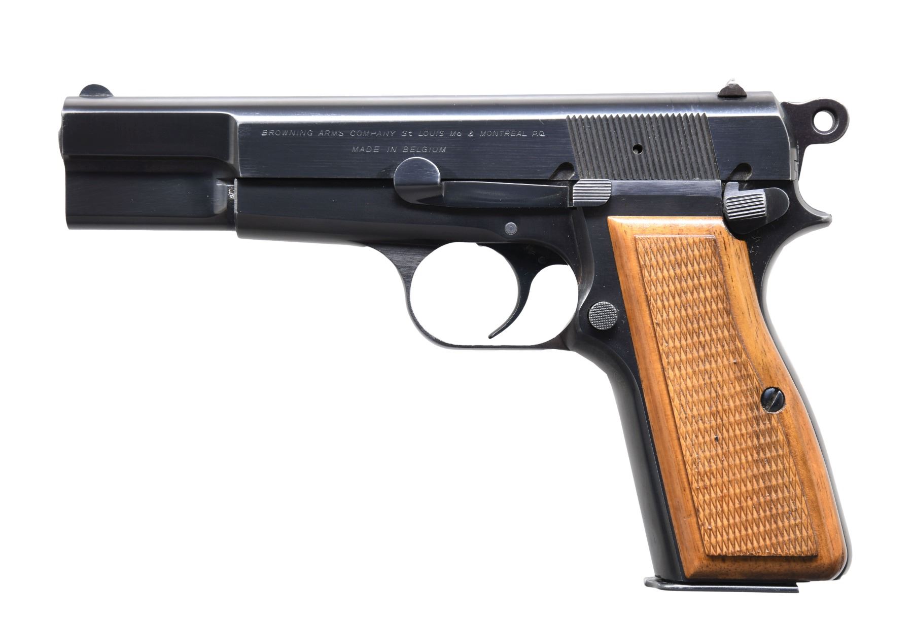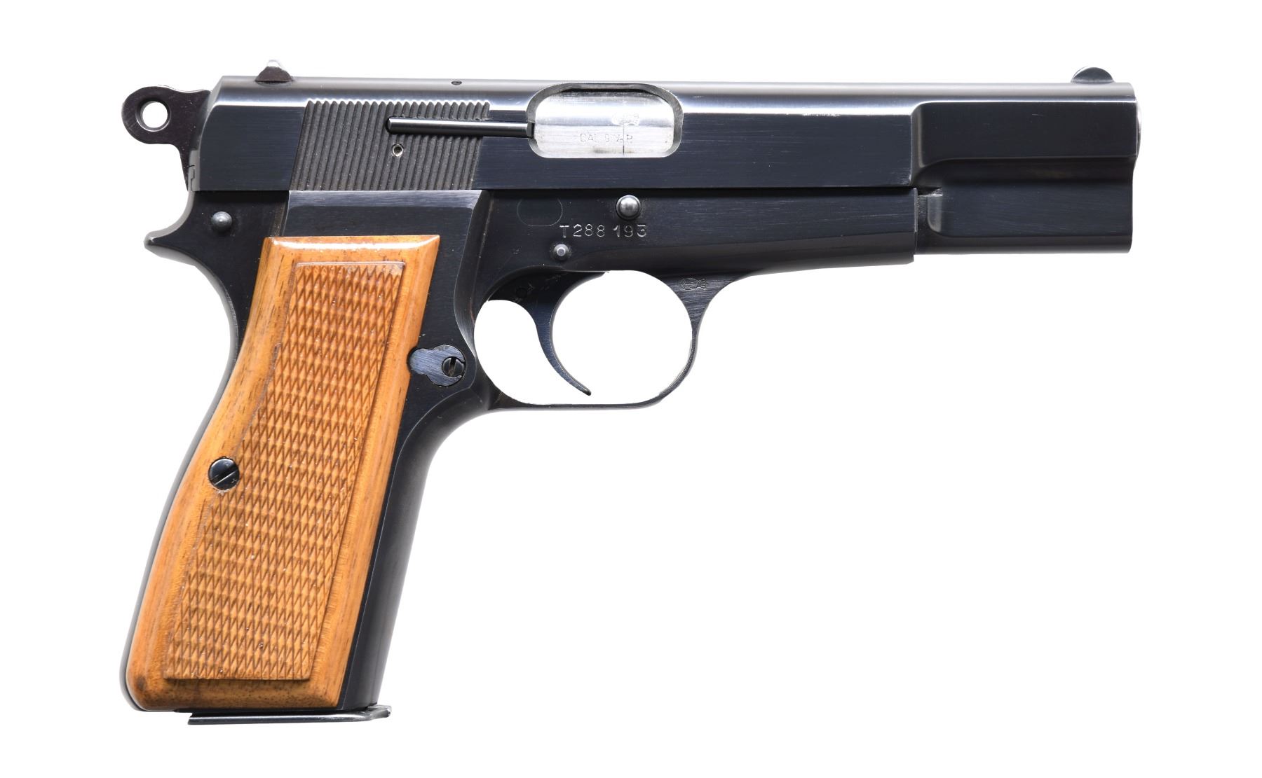 GUN 1: Model. Hi-Power. Cal. 9mm. S# T288193. Bbl. 4 5/8". Single action pistol w/ ring hammer. Semi-circular front sight w/ fixed U notch rear sight. Two piece checkered walnut grips. MAGS: 1 detachable 13 rd. CONDITION: near excellent, showing spots of edge wear & fine scratches. Grips show small handling marks. (25-920/DS).